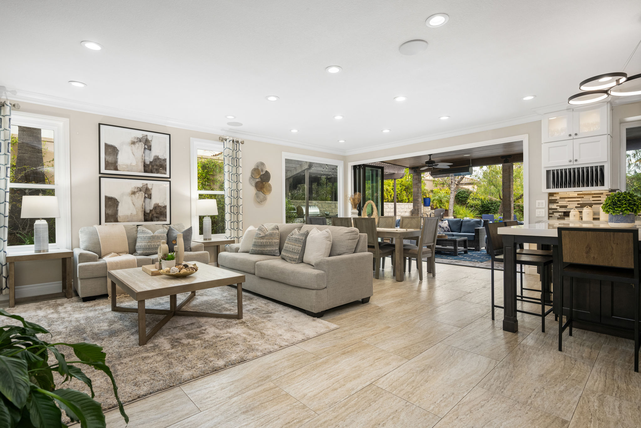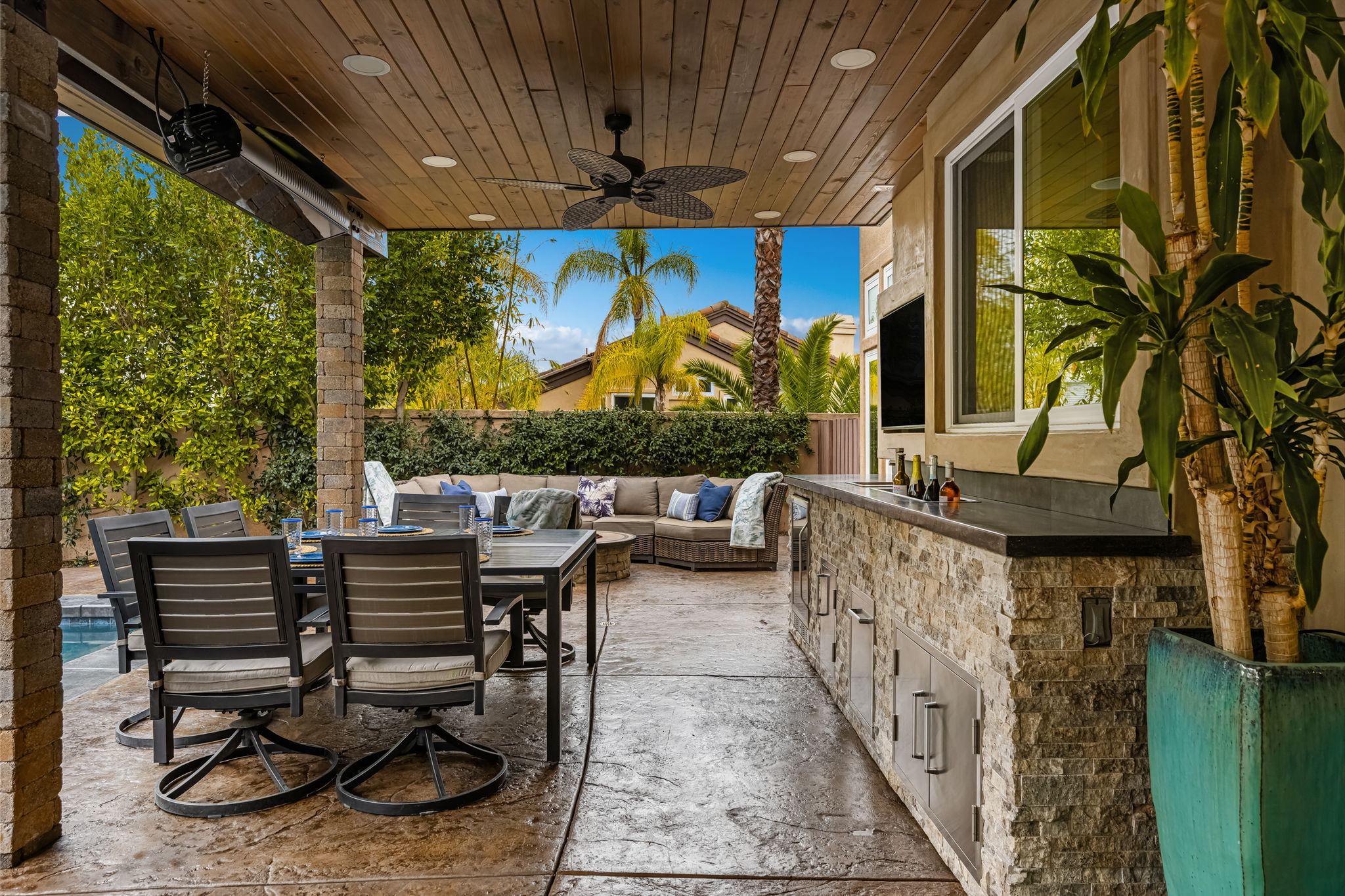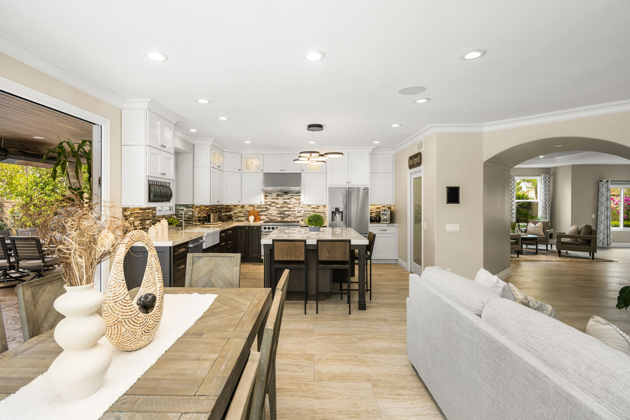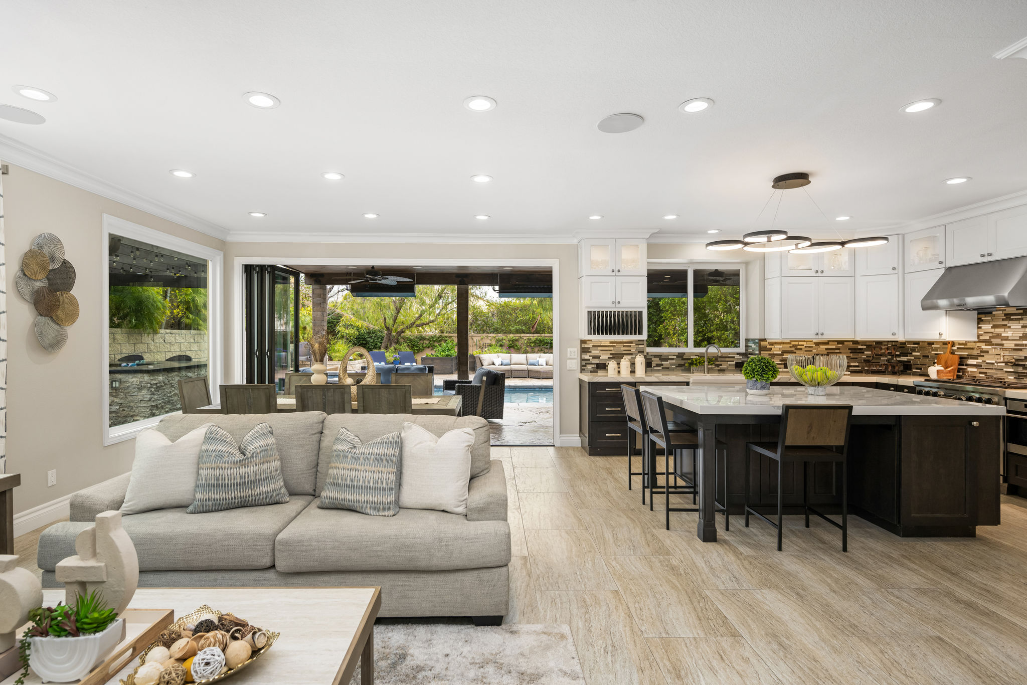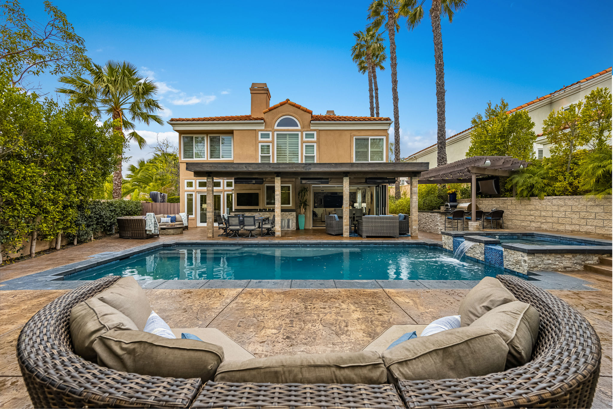 This is the one you've been waiting for — THE CROWN JEWEL OF FOOTHILL RANCH! Experience the exceptional luxury of this one-of-a-kind property with an expansive backyard oasis reminiscent of a 5-star resort. This newly remodeled masterpiece blends sophistication and exquisite architectural design, tailored for the discerning buyer. Featuring five en-suite bedrooms, 5.5 bathrooms, two fireplaces, and 4,000 sq. ft. of elegance and luxury. This entertainer's dream home welcomes you with a grand entrance into the formal living room, warmed by a fireplace and highlighted by a sweeping staircase. Custom-tiled flooring flows seamlessly through the open spaces, leading into the heart of the home — your dream kitchen. Top-of-the-line appliances include a Wolf dual-range six-burner stove, convection oven, Wolf Pro wall-vented hood, Wolf convection steam oven, Frigidaire Professional refrigerator, Bosch Silence dishwasher, and an in-wall pot filler. These complement the oversized island with seating. Quartz countertops, a custom glass backsplash, and a walk-in pantry complete this culinary haven. The family room and dining area embrace the open-concept floor plan, enhanced by expansive folding glass doors that seamlessly connect the indoor and outdoor living spaces. Guests will appreciate the downstairs en-suite bedroom, while the separate dedicated office offers serene views of the beautiful backyard. The primary suite with a retreat boasts a two-sided fireplace, a remodeled bath with separate vanities, a soaking tub, a custom spa shower with multiple shower heads, and a large walk-in closet with custom organizers. A loft with a media center and a laundry room serves the three additional spacious en-suite bedrooms. Custom upgrades include all-new doors, vinyl windows, a whole-house whisper fan, seller-owned solar, 15-foot retractable wall-to-patio folding doors, and two variable-speed heat pumps with zone ducting. The home automation system distributes audio/video and integrates lighting, security, HVAC & pool controls w/ a touch. No expense was spared in the recently renovated resort-style entertainer's backyard, with a gorgeous pool and spa, a custom outdoor kitchen with a BBQ, a bar with a refrigerator, a warming tray, a pizza oven, and a wide-screen TV. Relax under the custom patio cover with built-in gas heaters, a wine trough, a fridge, sink, and wide-screen TV. Enjoy sunny lounging areas, a gas fire pit, and a large raised vegetable garden.