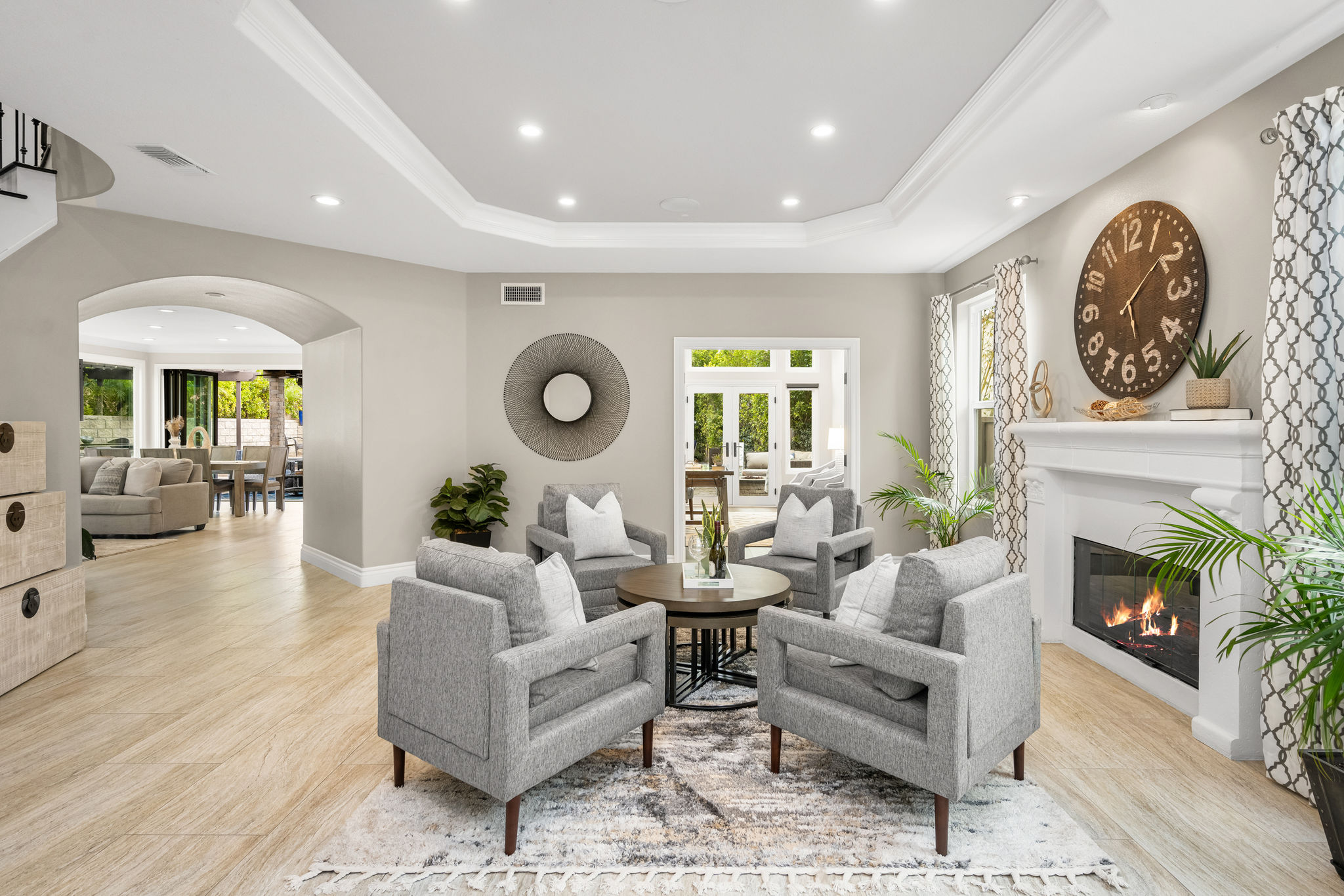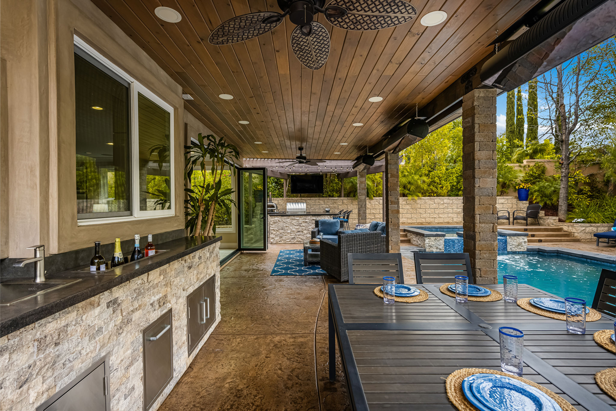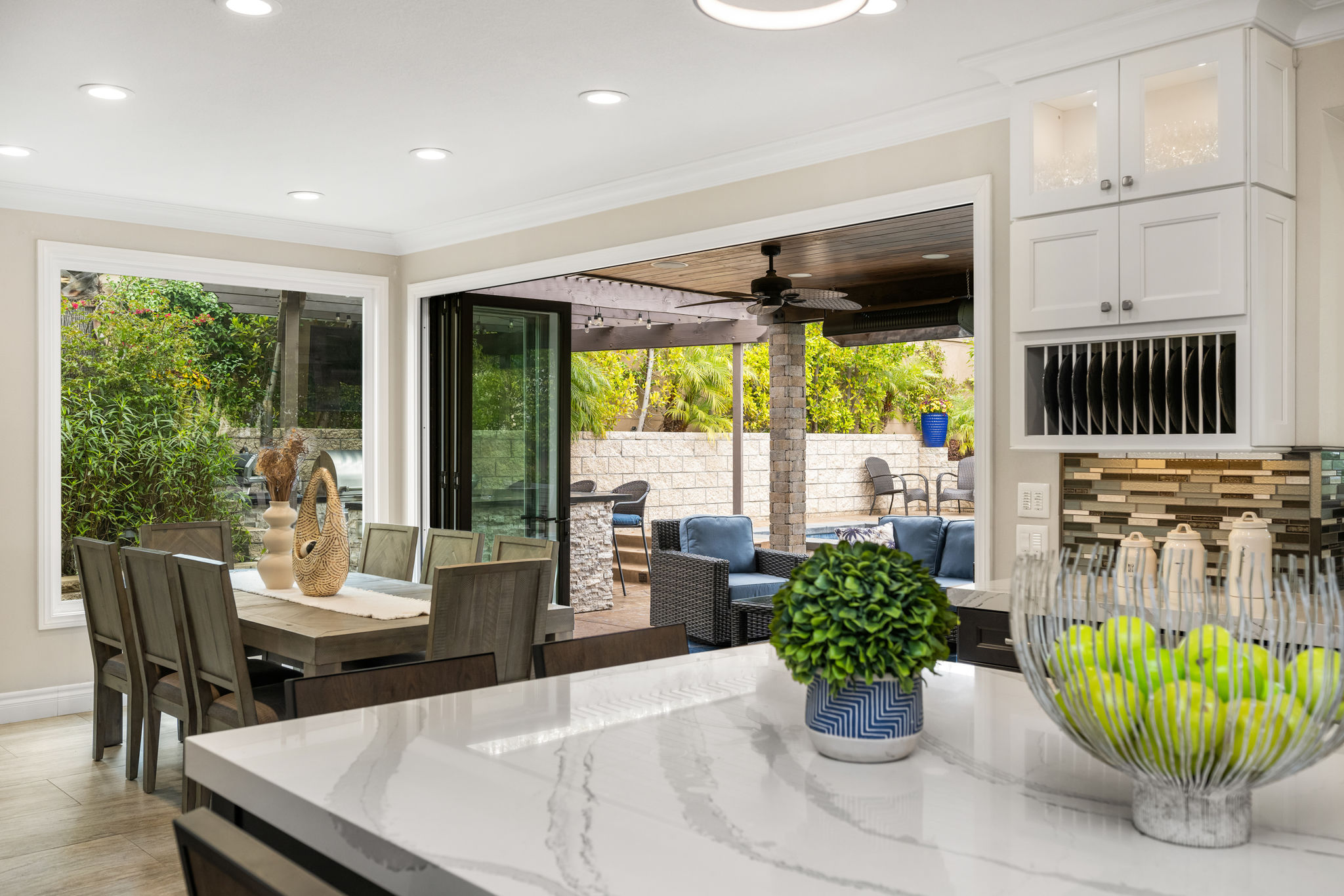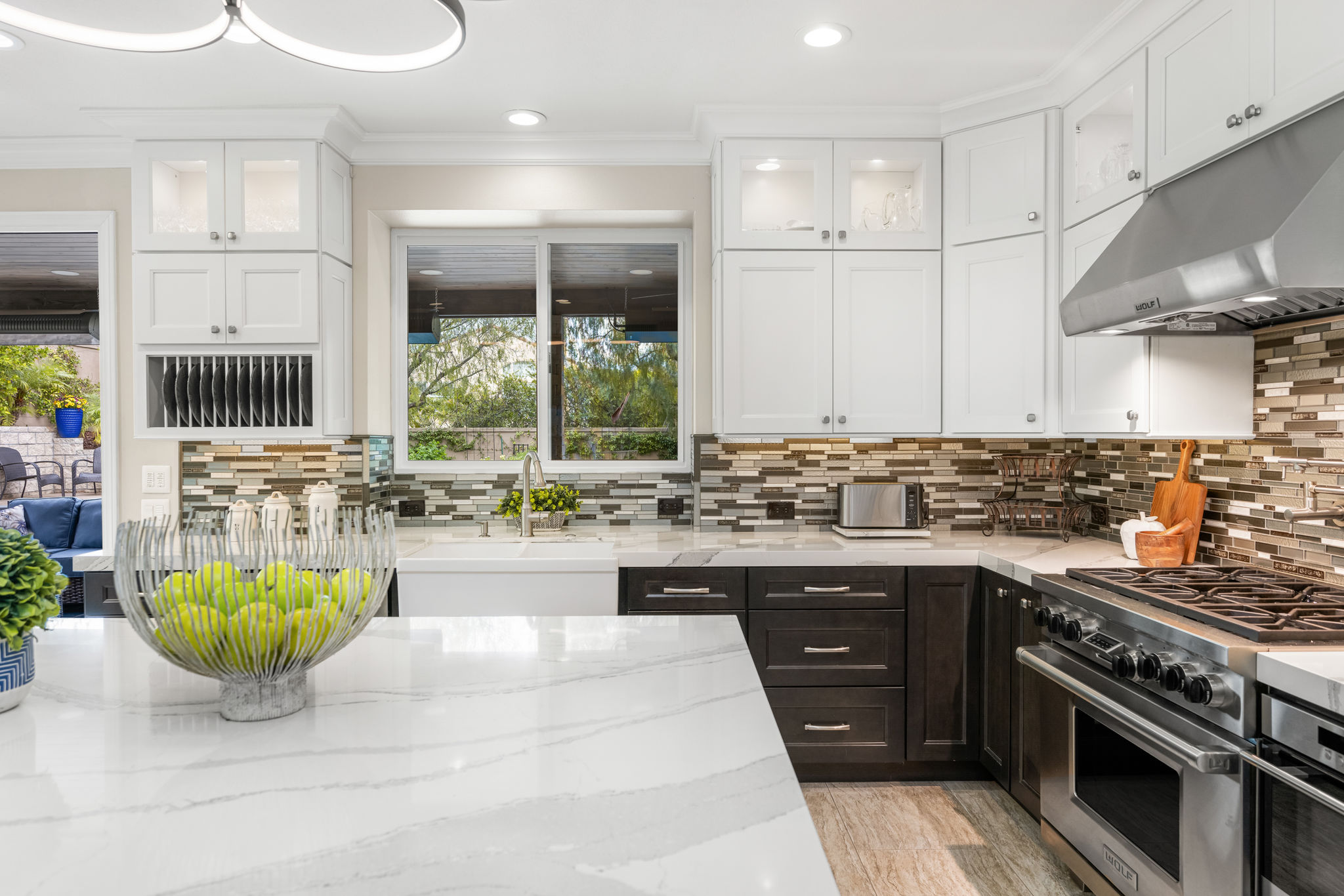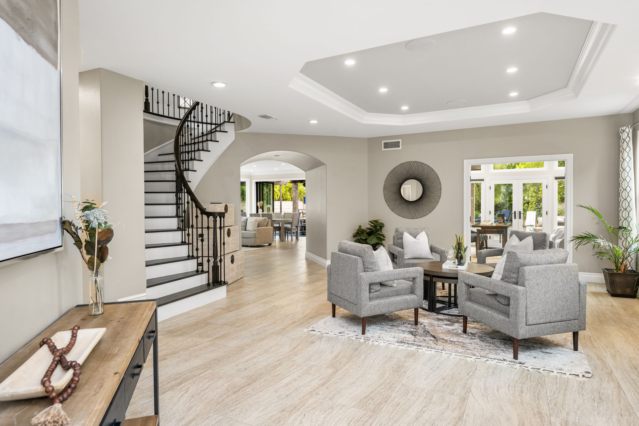 This is the one you've been waiting for — THE CROWN JEWEL OF FOOTHILL RANCH! Experience the exceptional luxury of this one-of-a-kind property with an expansive backyard oasis reminiscent of a 5-star resort. This newly remodeled masterpiece blends sophistication and exquisite architectural design, tailored for the discerning buyer. Featuring five en-suite bedrooms, 5.5 bathrooms, two fireplaces, and 4,000 sq. ft. of elegance and luxury. This entertainer's dream home welcomes you with a grand entrance into the formal living room, warmed by a fireplace and highlighted by a sweeping staircase. Custom-tiled flooring flows seamlessly through the open spaces, leading into the heart of the home — your dream kitchen. Top-of-the-line appliances include a Wolf dual-range six-burner stove, convection oven, Wolf Pro wall-vented hood, Wolf convection steam oven, Frigidaire Professional refrigerator, Bosch Silence dishwasher, and an in-wall pot filler. These complement the oversized island with seating. Quartz countertops, a custom glass backsplash, and a walk-in pantry complete this culinary haven. The family room and dining area embrace the open-concept floor plan, enhanced by expansive folding glass doors that seamlessly connect the indoor and outdoor living spaces. Guests will appreciate the downstairs en-suite bedroom, while the separate dedicated office offers serene views of the beautiful backyard. The primary suite with a retreat boasts a two-sided fireplace, a remodeled bath with separate vanities, a soaking tub, a custom spa shower with multiple shower heads, and a large walk-in closet with custom organizers. A loft with a media center and a laundry room serves the three additional spacious en-suite bedrooms. Custom upgrades include all-new doors, vinyl windows, a whole-house whisper fan, seller-owned solar, 15-foot retractable wall-to-patio folding doors, and two variable-speed heat pumps with zone ducting. The home automation system distributes audio/video and integrates lighting, security, HVAC & pool controls w/ a touch. No expense was spared in the recently renovated resort-style entertainer's backyard, with a gorgeous pool and spa, a custom outdoor kitchen with a BBQ, a bar with a refrigerator, a warming tray, a pizza oven, and a wide-screen TV. Relax under the custom patio cover with built-in gas heaters, a wine trough, a fridge, sink, and wide-screen TV. Enjoy sunny lounging areas, a gas fire pit, and a large raised vegetable garden.