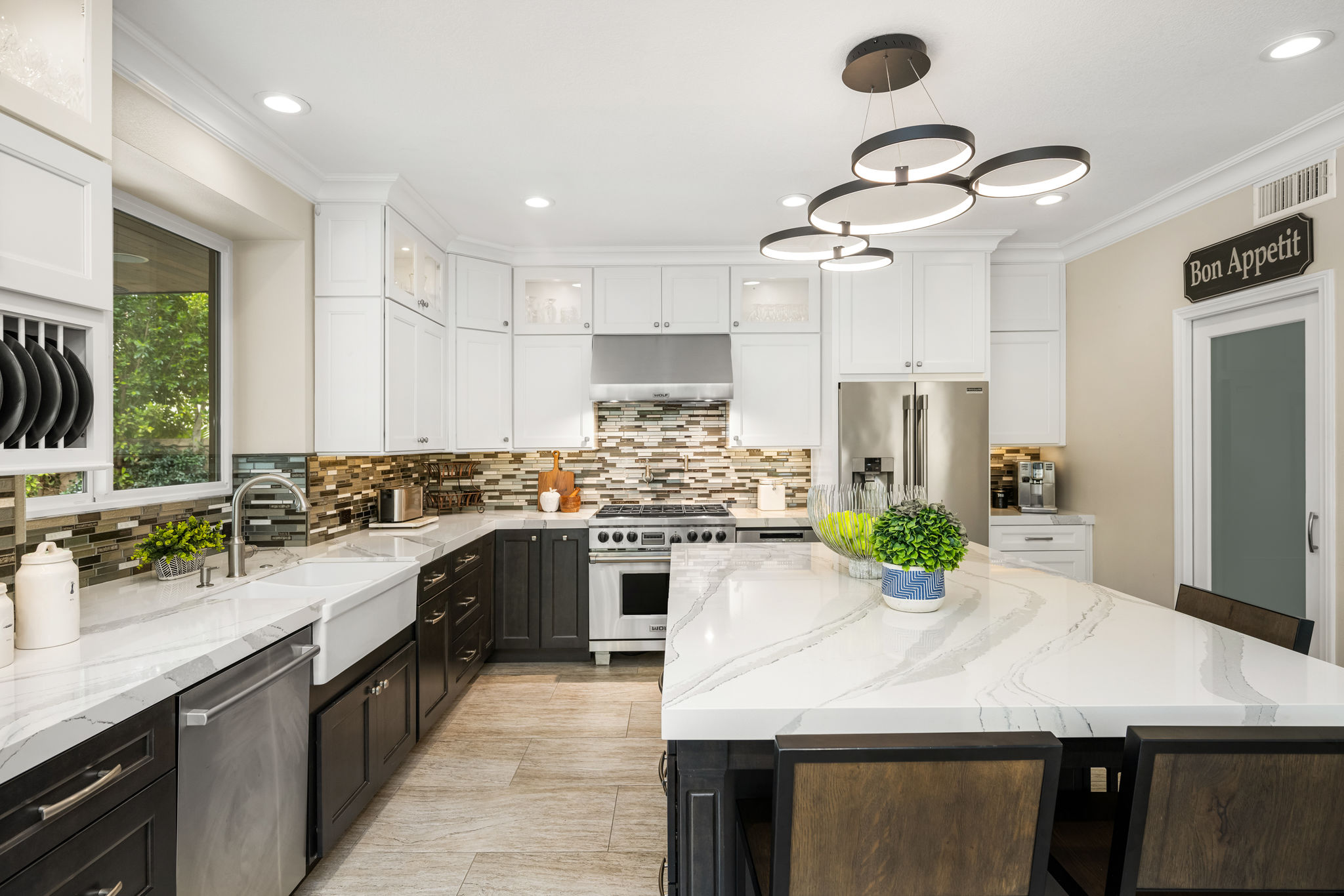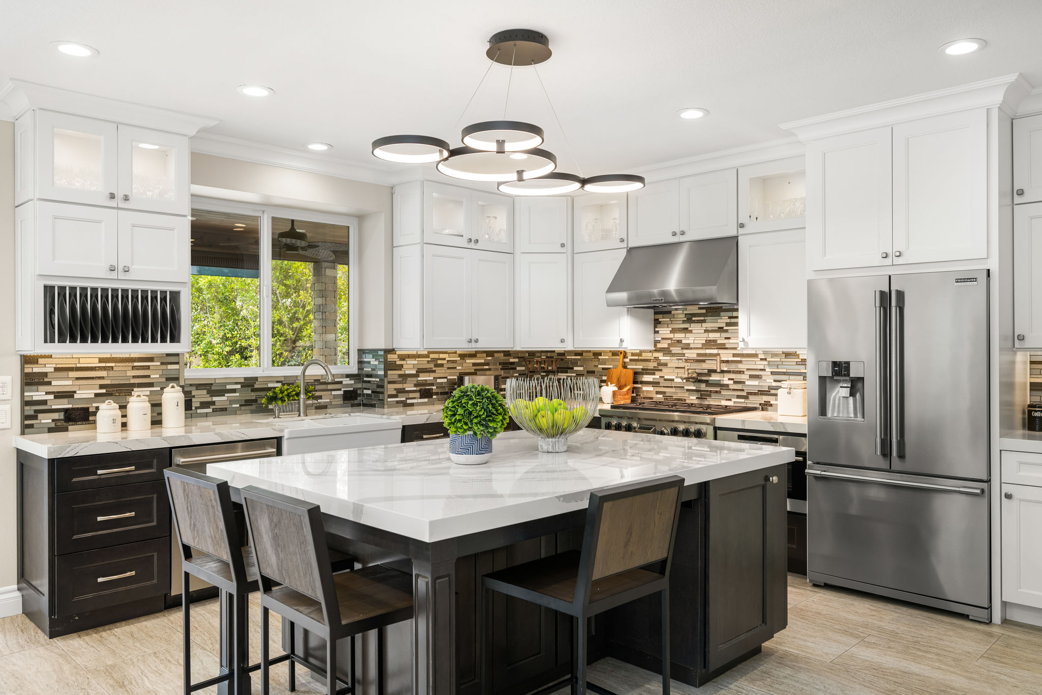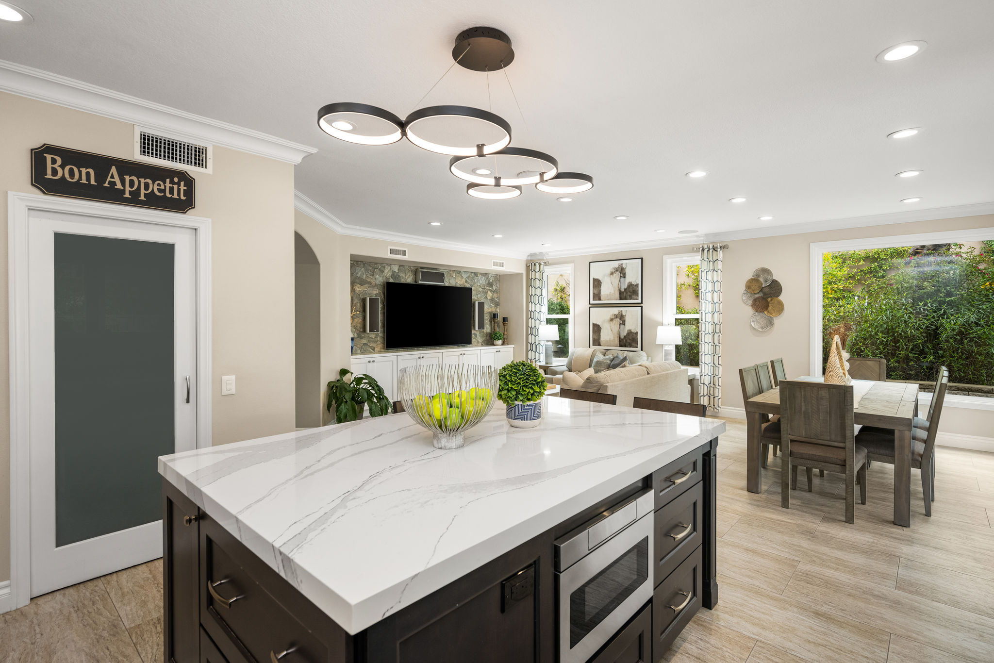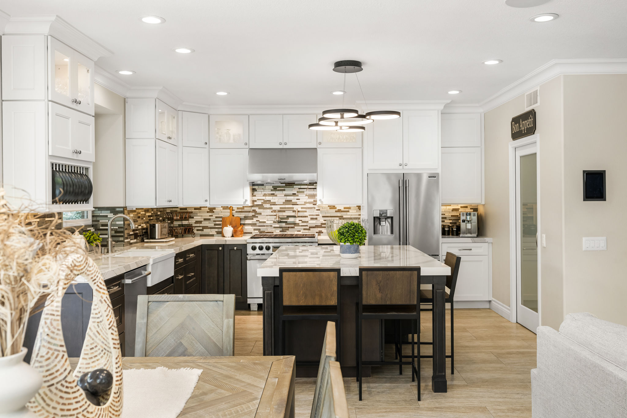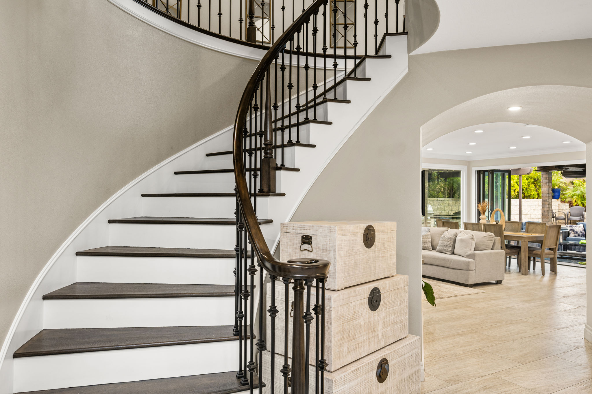 This is the one you've been waiting for — THE CROWN JEWEL OF FOOTHILL RANCH! Experience the exceptional luxury of this one-of-a-kind property with an expansive backyard oasis reminiscent of a 5-star resort. This newly remodeled masterpiece blends sophistication and exquisite architectural design, tailored for the discerning buyer. Featuring five en-suite bedrooms, 5.5 bathrooms, two fireplaces, and 4,000 sq. ft. of elegance and luxury. This entertainer's dream home welcomes you with a grand entrance into the formal living room, warmed by a fireplace and highlighted by a sweeping staircase. Custom-tiled flooring flows seamlessly through the open spaces, leading into the heart of the home — your dream kitchen. Top-of-the-line appliances include a Wolf dual-range six-burner stove, convection oven, Wolf Pro wall-vented hood, Wolf convection steam oven, Frigidaire Professional refrigerator, Bosch Silence dishwasher, and an in-wall pot filler. These complement the oversized island with seating. Quartz countertops, a custom glass backsplash, and a walk-in pantry complete this culinary haven. The family room and dining area embrace the open-concept floor plan, enhanced by expansive folding glass doors that seamlessly connect the indoor and outdoor living spaces. Guests will appreciate the downstairs en-suite bedroom, while the separate dedicated office offers serene views of the beautiful backyard. The primary suite with a retreat boasts a two-sided fireplace, a remodeled bath with separate vanities, a soaking tub, a custom spa shower with multiple shower heads, and a large walk-in closet with custom organizers. A loft with a media center and a laundry room serves the three additional spacious en-suite bedrooms. Custom upgrades include all-new doors, vinyl windows, a whole-house whisper fan, seller-owned solar, 15-foot retractable wall-to-patio folding doors, and two variable-speed heat pumps with zone ducting. The home automation system distributes audio/video and integrates lighting, security, HVAC & pool controls w/ a touch. No expense was spared in the recently renovated resort-style entertainer's backyard, with a gorgeous pool and spa, a custom outdoor kitchen with a BBQ, a bar with a refrigerator, a warming tray, a pizza oven, and a wide-screen TV. Relax under the custom patio cover with built-in gas heaters, a wine trough, a fridge, sink, and wide-screen TV. Enjoy sunny lounging areas, a gas fire pit, and a large raised vegetable garden.