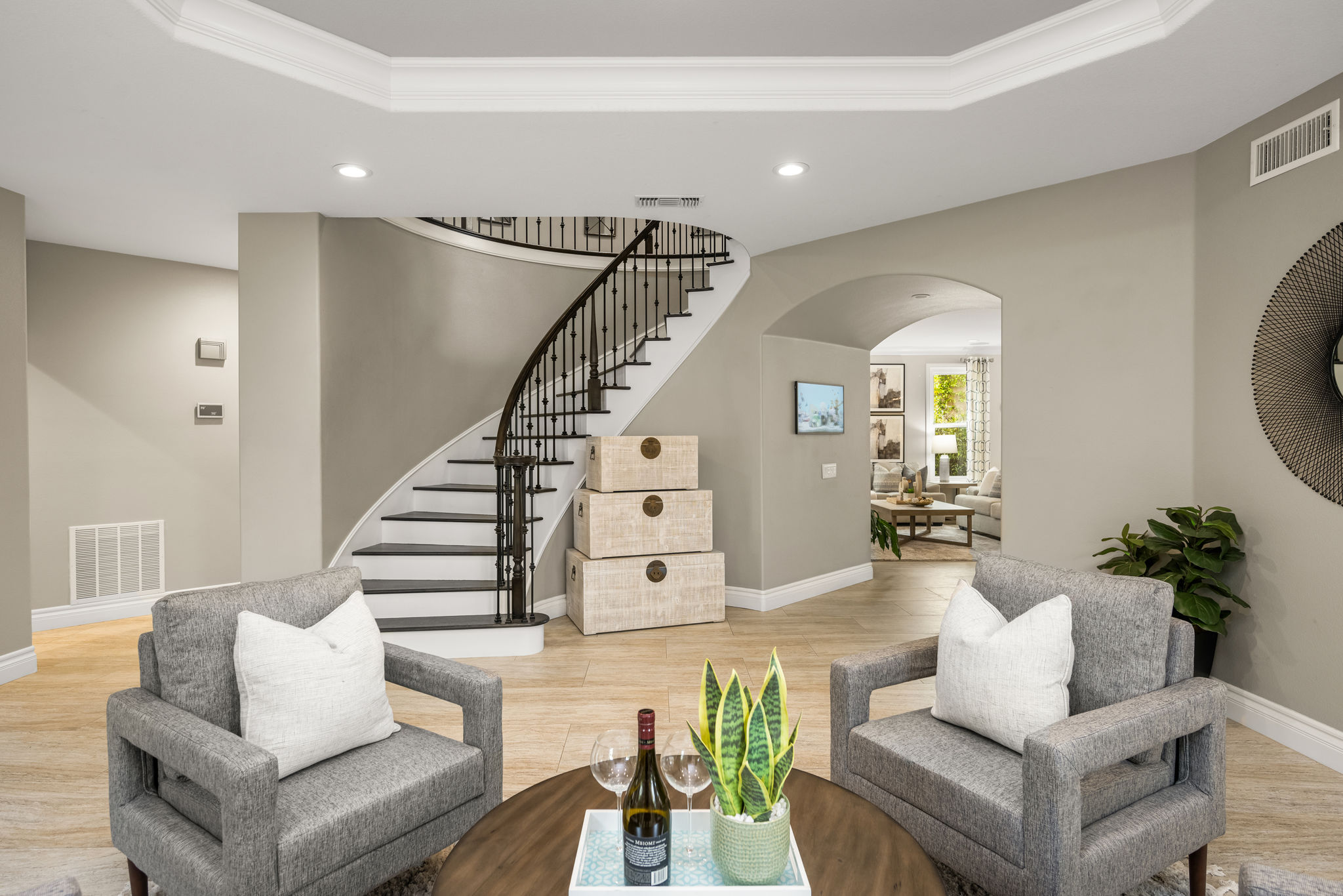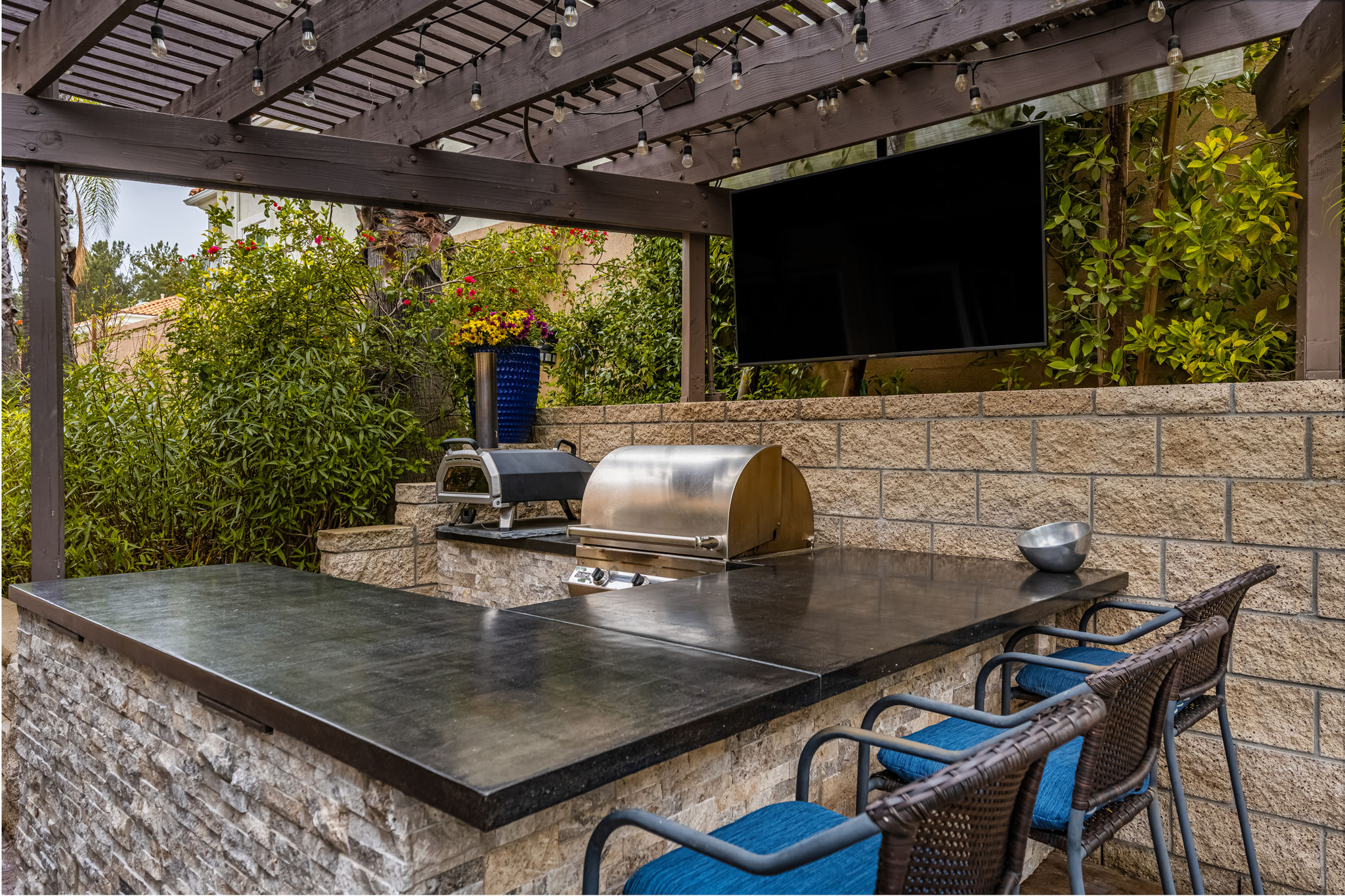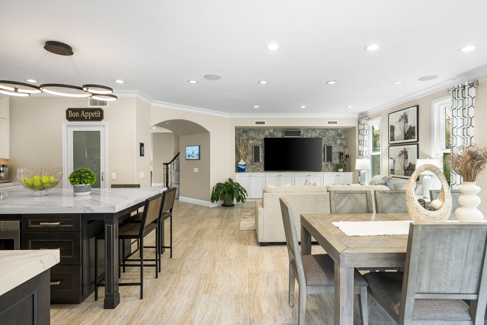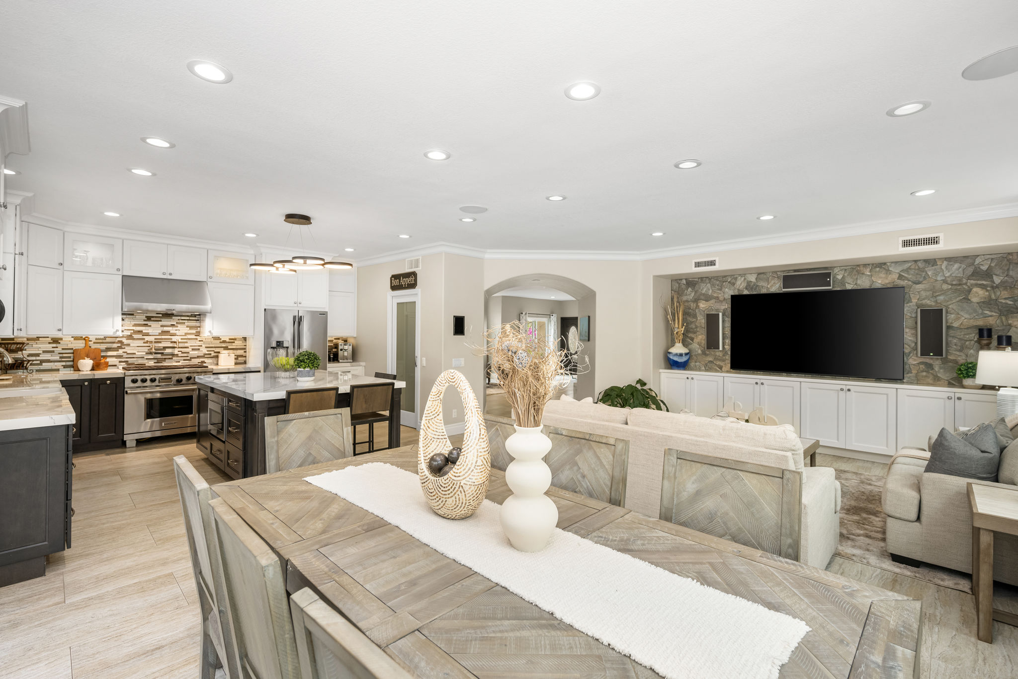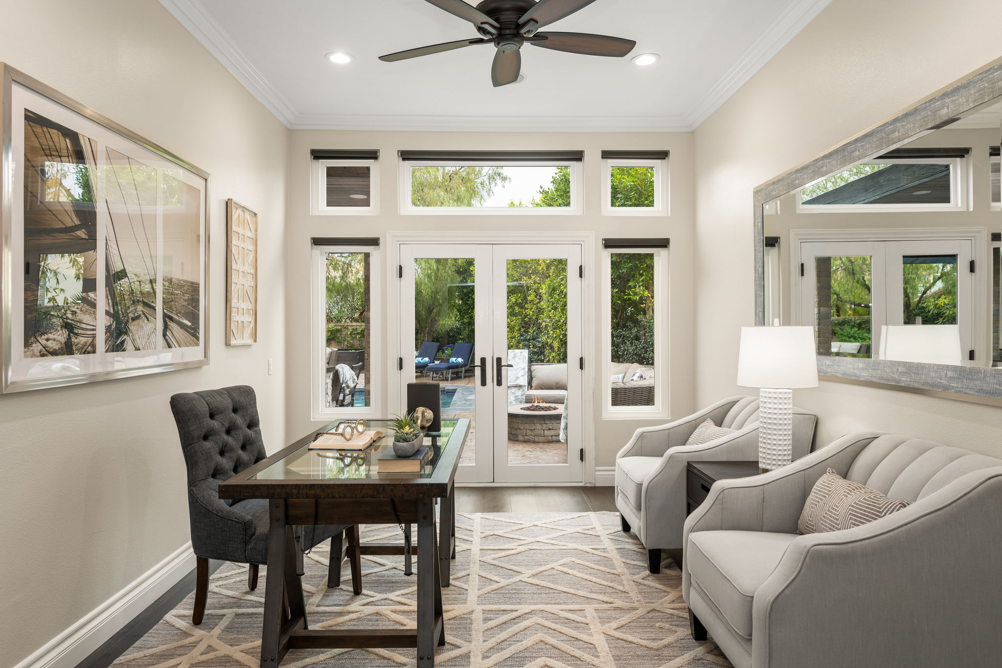 This is the one you've been waiting for — THE CROWN JEWEL OF FOOTHILL RANCH! Experience the exceptional luxury of this one-of-a-kind property with an expansive backyard oasis reminiscent of a 5-star resort. This newly remodeled masterpiece blends sophistication and exquisite architectural design, tailored for the discerning buyer. Featuring five en-suite bedrooms, 5.5 bathrooms, two fireplaces, and 4,000 sq. ft. of elegance and luxury. This entertainer's dream home welcomes you with a grand entrance into the formal living room, warmed by a fireplace and highlighted by a sweeping staircase. Custom-tiled flooring flows seamlessly through the open spaces, leading into the heart of the home — your dream kitchen. Top-of-the-line appliances include a Wolf dual-range six-burner stove, convection oven, Wolf Pro wall-vented hood, Wolf convection steam oven, Frigidaire Professional refrigerator, Bosch Silence dishwasher, and an in-wall pot filler. These complement the oversized island with seating. Quartz countertops, a custom glass backsplash, and a walk-in pantry complete this culinary haven. The family room and dining area embrace the open-concept floor plan, enhanced by expansive folding glass doors that seamlessly connect the indoor and outdoor living spaces. Guests will appreciate the downstairs en-suite bedroom, while the separate dedicated office offers serene views of the beautiful backyard. The primary suite with a retreat boasts a two-sided fireplace, a remodeled bath with separate vanities, a soaking tub, a custom spa shower with multiple shower heads, and a large walk-in closet with custom organizers. A loft with a media center and a laundry room serves the three additional spacious en-suite bedrooms. Custom upgrades include all-new doors, vinyl windows, a whole-house whisper fan, seller-owned solar, 15-foot retractable wall-to-patio folding doors, and two variable-speed heat pumps with zone ducting. The home automation system distributes audio/video and integrates lighting, security, HVAC & pool controls w/ a touch. No expense was spared in the recently renovated resort-style entertainer's backyard, with a gorgeous pool and spa, a custom outdoor kitchen with a BBQ, a bar with a refrigerator, a warming tray, a pizza oven, and a wide-screen TV. Relax under the custom patio cover with built-in gas heaters, a wine trough, a fridge, sink, and wide-screen TV. Enjoy sunny lounging areas, a gas fire pit, and a large raised vegetable garden.