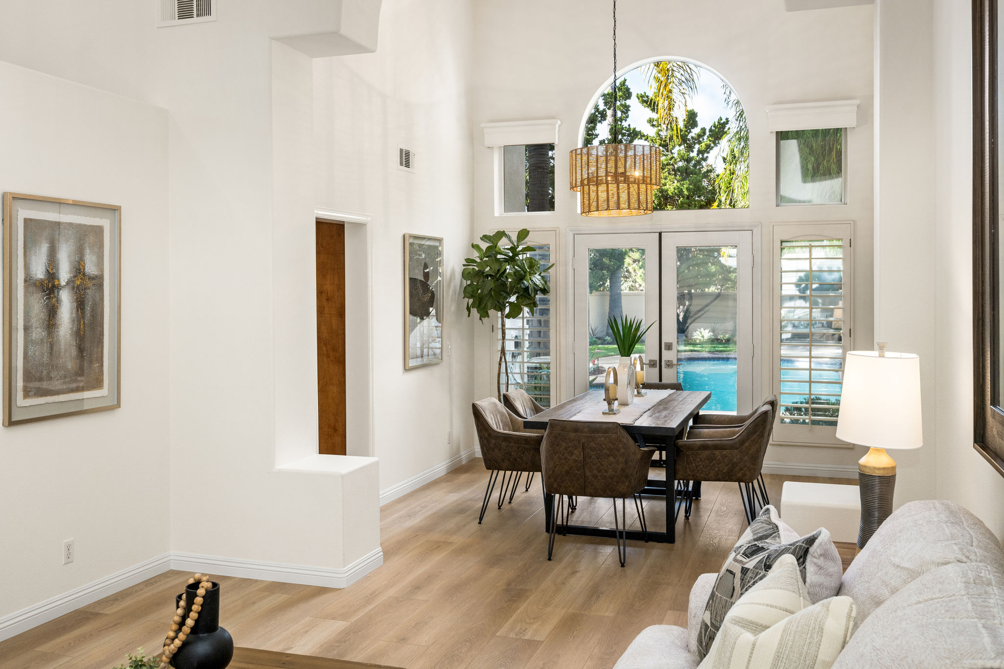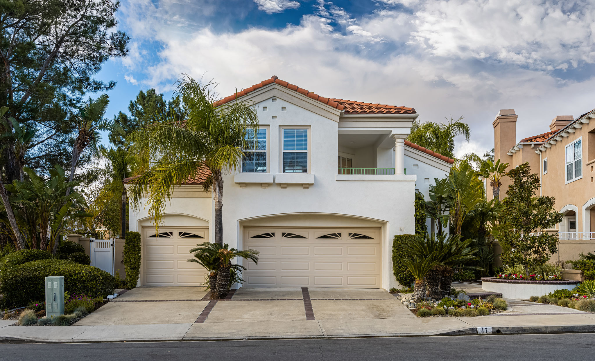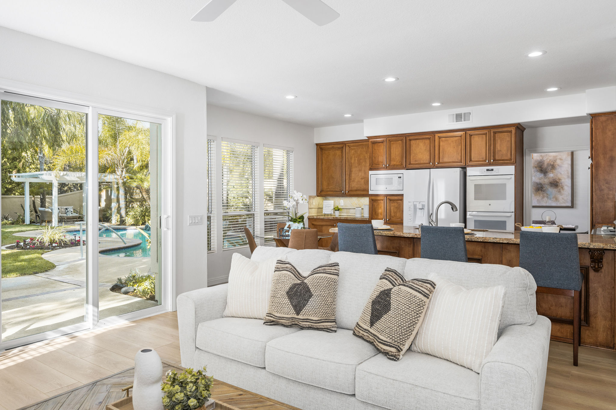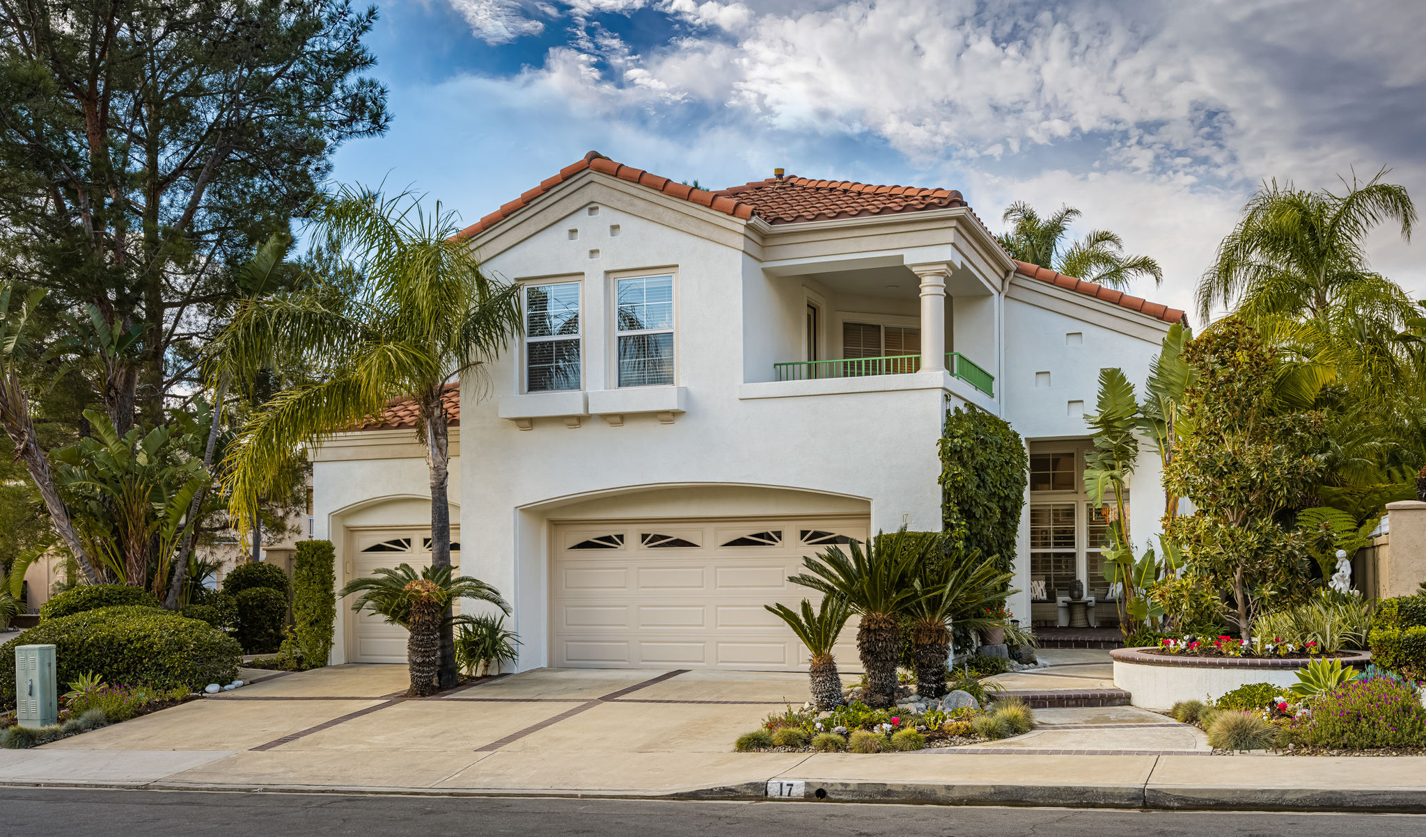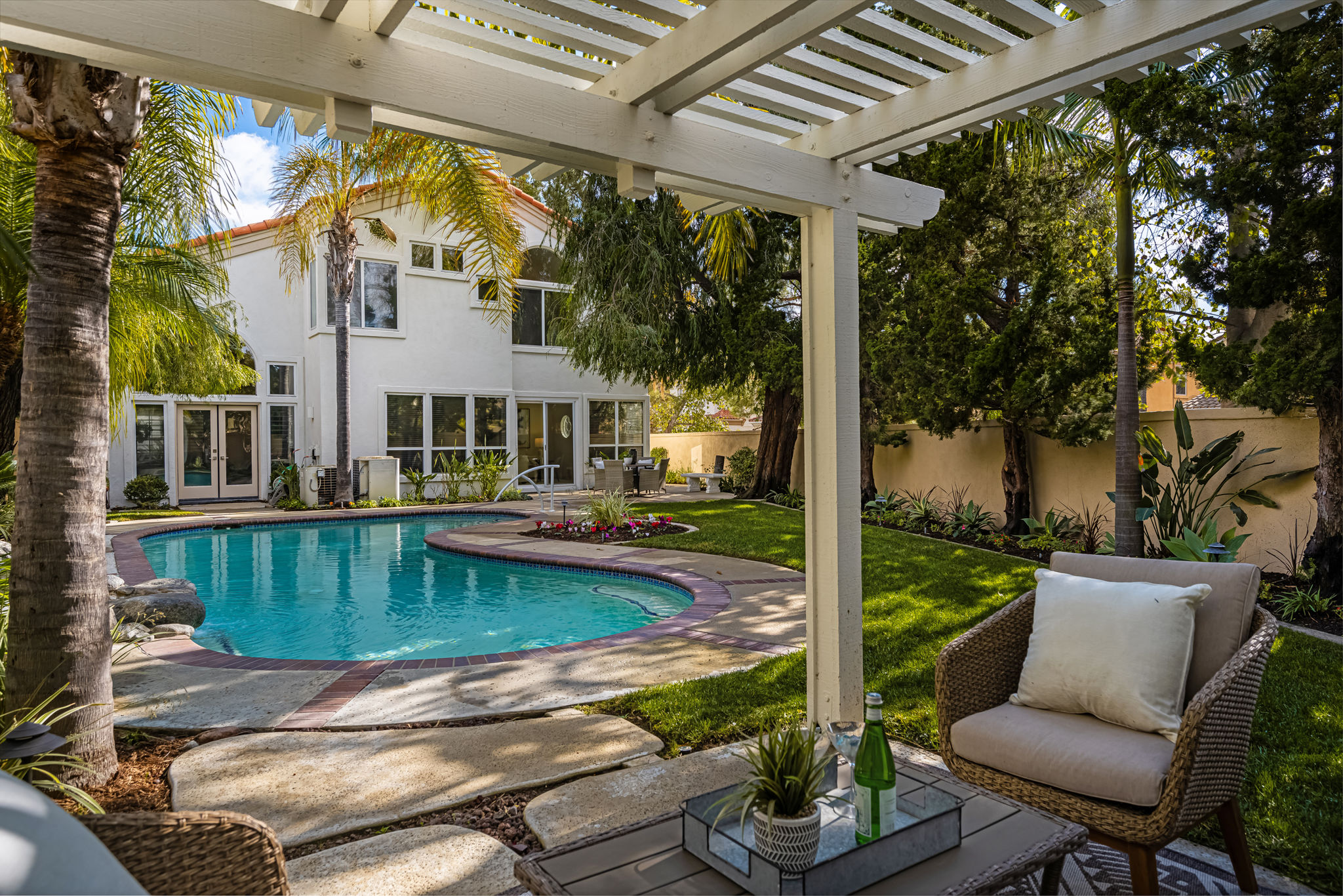 Escape the ordinary and discover exceptional luxury in this model home within the highly sought-after Roxford Crest tract. This stunning Mediterranean showplace is truly amazing.  Exquisite interior architecture and designer upgrades welcome you, while the family-oriented floor plan offers comfort and casual living for everyone.  The prime corner location sits on an oversized 7,975 sqft lot and features four spacious bedrooms, three full bathrooms, and a loft, with a total of 2,902 sqft.  A dramatic grand entrance greets you with soaring 30 ft ceilings, formal living and dining rooms, walls of windows filling the home with natural light, and a sweeping staircase highlighted by a skylight.  Custom upgrades throughout this lovely home include new interior paint, brand-new luxury vinyl flooring, plantation shutters, upgraded baseboards, mirrored wardrobes, ceiling fans and new light fixtures, recessed lighting, wood blinds, and a new saltwater pool system and equipment.  A convenient downstairs bedroom, perfect as an office, is adjacent to a remodeled full bathroom.  The expansive kitchen features granite countertops, a custom stone backsplash, rich wood cabinetry, a pantry, and ample counter space.  The open family room with a warm fireplace and custom granite mantel is perfect for family gatherings.  A downstairs laundry room includes a sink and cabinets for added convenience.  The spacious primary suite boasts high ceilings, a view of the backyard, a large walk-in closet, dual vanities, a soaking tub, and a separate shower enclosure.  The versatile loft can serve as a media room, office, or teen space. Two additional bedrooms are generously sized, with one offering a private balcony.  The backyard is a tranquil sanctuary featuring a sparkling saltwater pool, patio, and mature trees, creating a park-like setting perfect for relaxation and entertaining.  This home has it all—don’t miss out! Hurry!