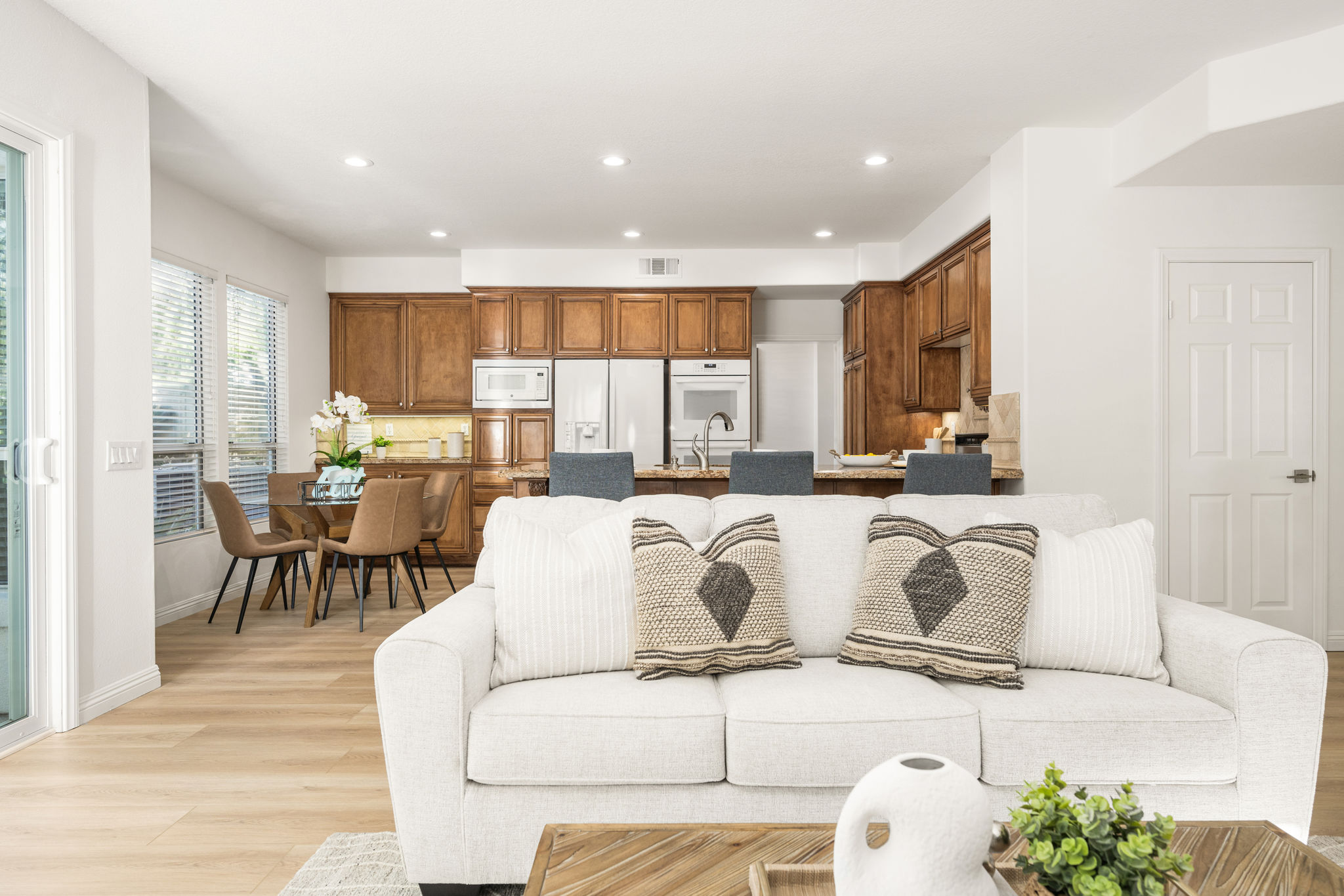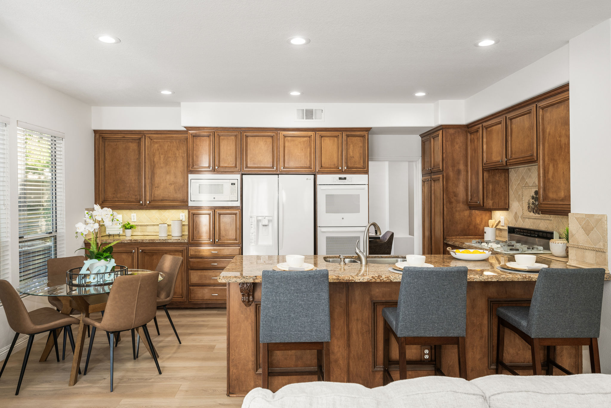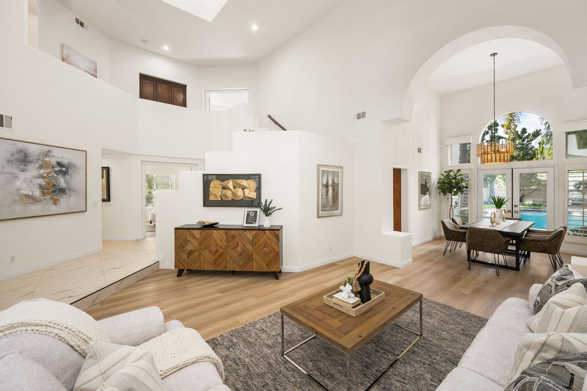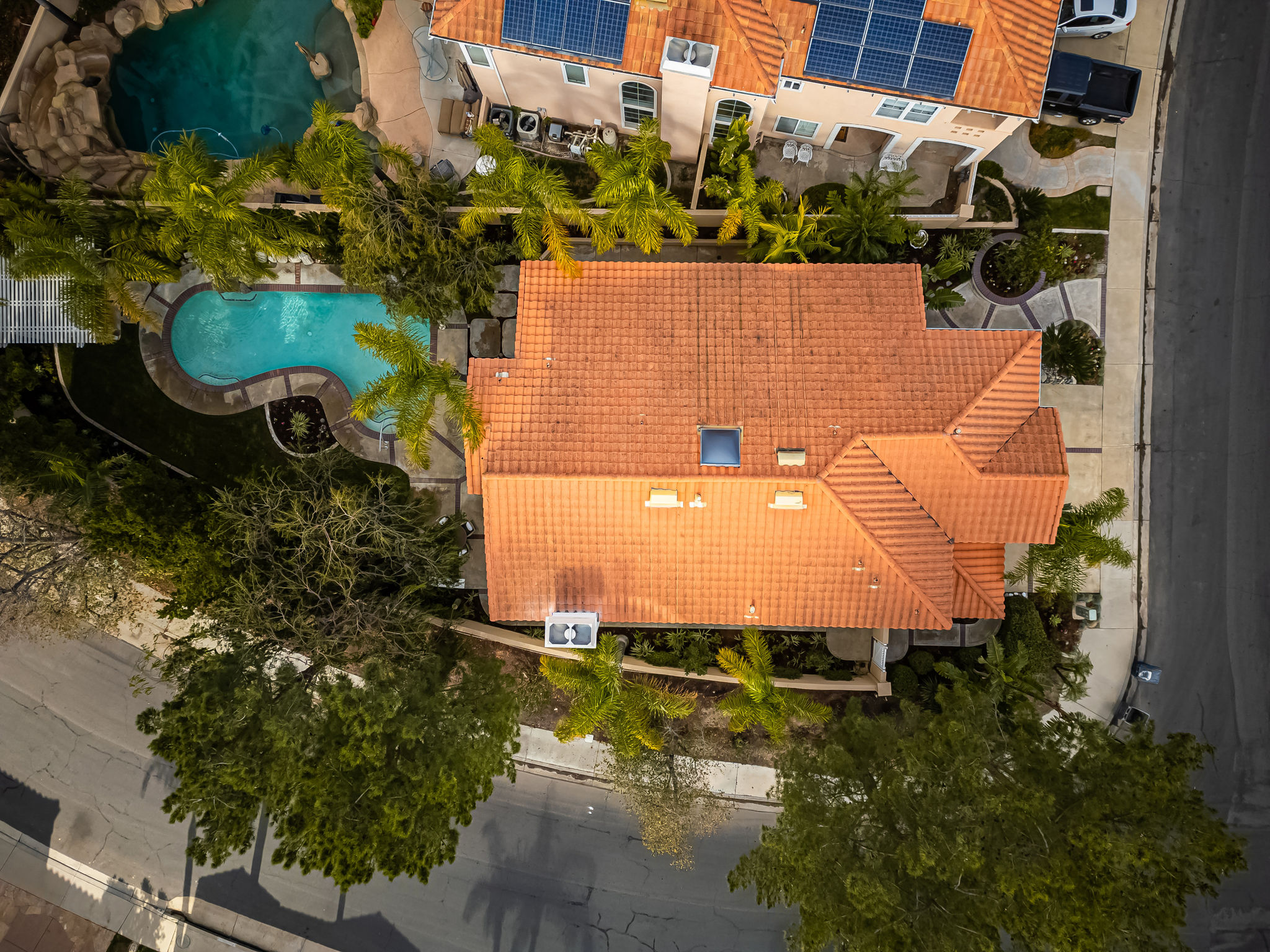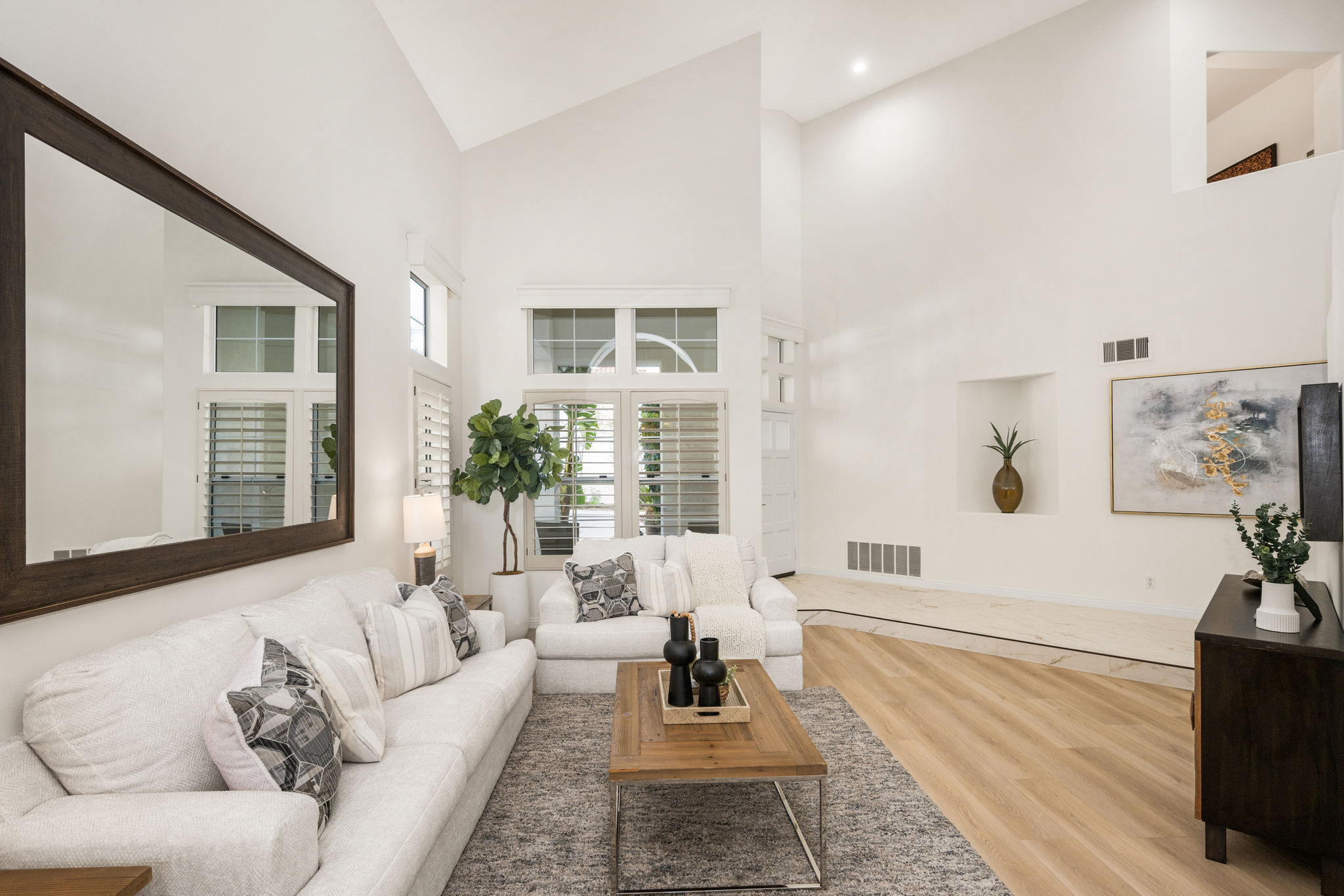 Escape the ordinary and discover exceptional luxury in this model home within the highly sought-after Roxford Crest tract. This stunning Mediterranean showplace is truly amazing.  Exquisite interior architecture and designer upgrades welcome you, while the family-oriented floor plan offers comfort and casual living for everyone.  The prime corner location sits on an oversized 7,975 sqft lot and features four spacious bedrooms, three full bathrooms, and a loft, with a total of 2,902 sqft.  A dramatic grand entrance greets you with soaring 30 ft ceilings, formal living and dining rooms, walls of windows filling the home with natural light, and a sweeping staircase highlighted by a skylight.  Custom upgrades throughout this lovely home include new interior paint, brand-new luxury vinyl flooring, plantation shutters, upgraded baseboards, mirrored wardrobes, ceiling fans and new light fixtures, recessed lighting, wood blinds, and a new saltwater pool system and equipment.  A convenient downstairs bedroom, perfect as an office, is adjacent to a remodeled full bathroom.  The expansive kitchen features granite countertops, a custom stone backsplash, rich wood cabinetry, a pantry, and ample counter space.  The open family room with a warm fireplace and custom granite mantel is perfect for family gatherings.  A downstairs laundry room includes a sink and cabinets for added convenience.  The spacious primary suite boasts high ceilings, a view of the backyard, a large walk-in closet, dual vanities, a soaking tub, and a separate shower enclosure.  The versatile loft can serve as a media room, office, or teen space. Two additional bedrooms are generously sized, with one offering a private balcony.  The backyard is a tranquil sanctuary featuring a sparkling saltwater pool, patio, and mature trees, creating a park-like setting perfect for relaxation and entertaining.  This home has it all—don’t miss out! Hurry!