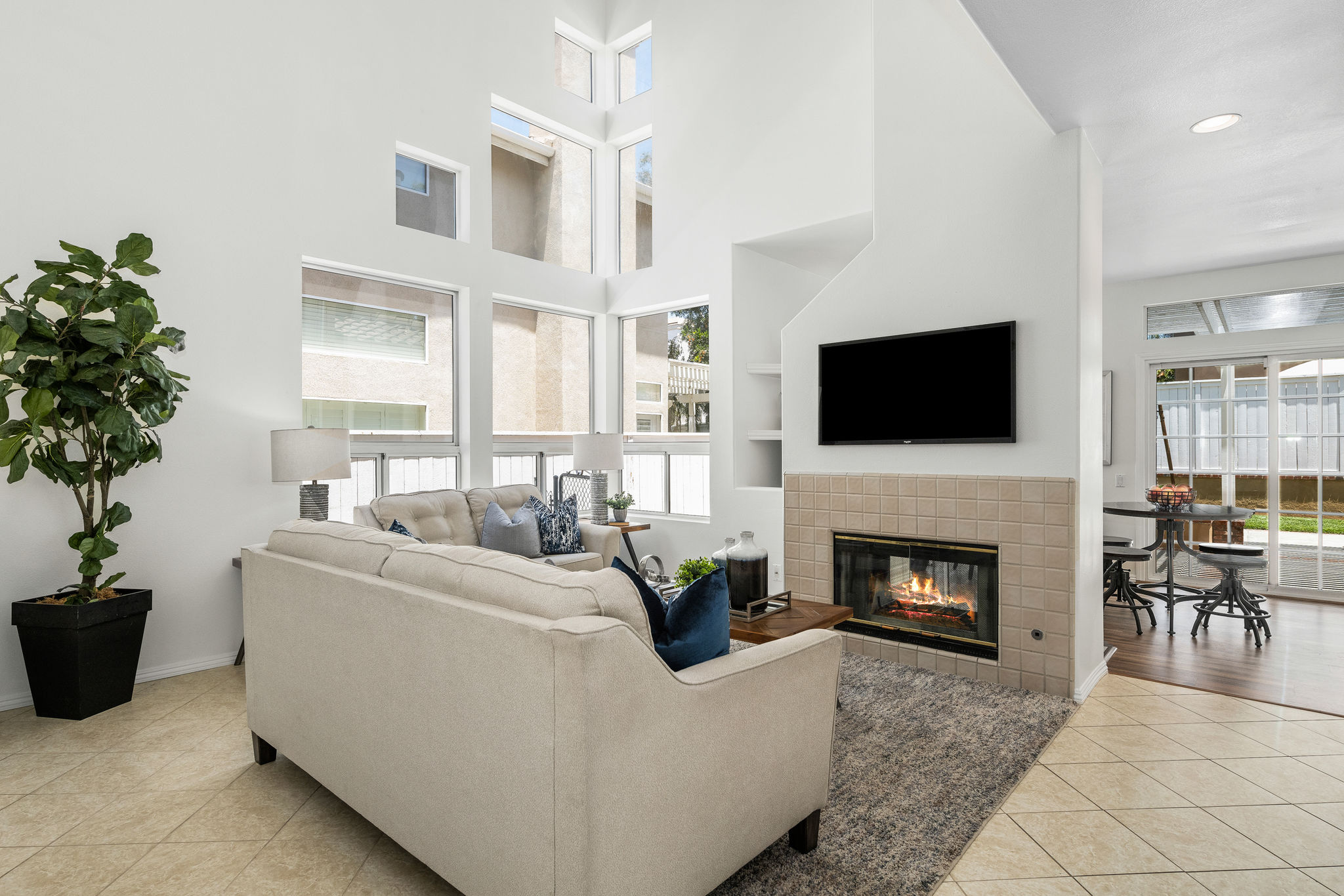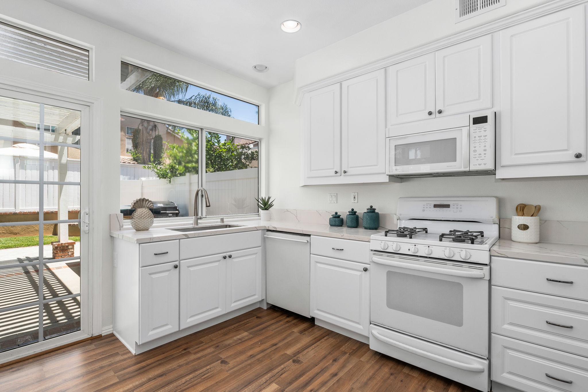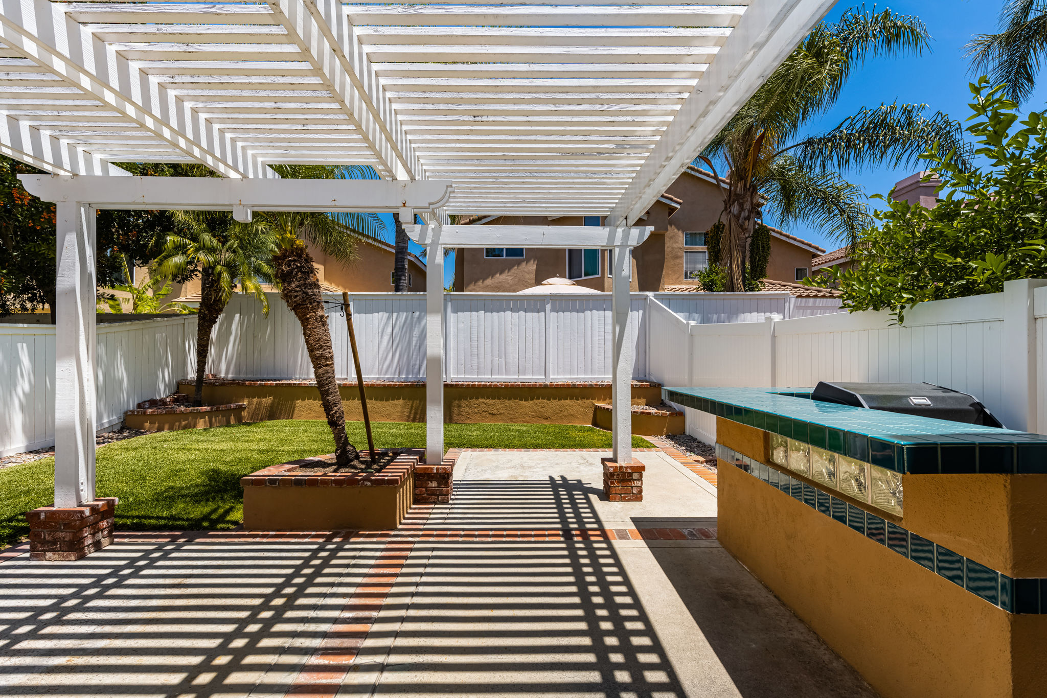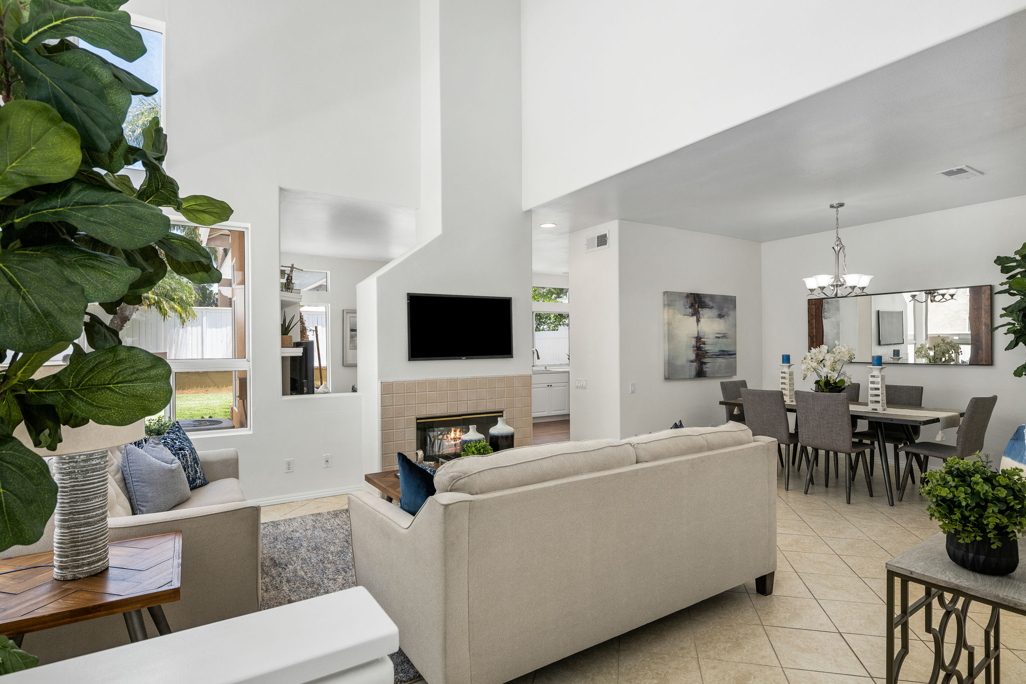 Nestled on a tree-lined street in the wonderful hillside community of Portola Hills. Wow!! This lovely home has it all. Prime location, amazing 3 bedrooms, 2.5 baths for well under $900,000 in South Orange County!! From the moment you enter the home, you'll notice the soaring two-story ceilings and walls of windows that bring in tons of natural infused light into the living room with a cozy double-sided fireplace and the formal dining area. You'll be greeted with a light modern decor with a freshly painted interior, accented with neutral tile, carpet flooring, and upgraded light fixtures. The east-facing kitchen has a sunny orientation with white cabinetry, gorgeous quartz countertops, recessed lighting, luxury wood vinyl floors, a nook area, custom wood built-ins, a fireplace, and a french slider that leads to the outside yard. Large downstairs laundry room, remodeled powder room and direct access to the two-car garage. The primary suite has a ceiling fan along with recessed lighting, remodeled bath with dual vanities, a tub, a shower, and cultured marble countertop. The two additional bedrooms share a secondary remodeled bathroom with a cultured marble countertop, walk-in shower, and new shower enclosure. The backyard is perfect for fun and entertaining with a brick trimmed patio, wood cover, Built-in BBQ with bar, a nice sized grass area and a sunny planter just waiting to become a Victory garden.