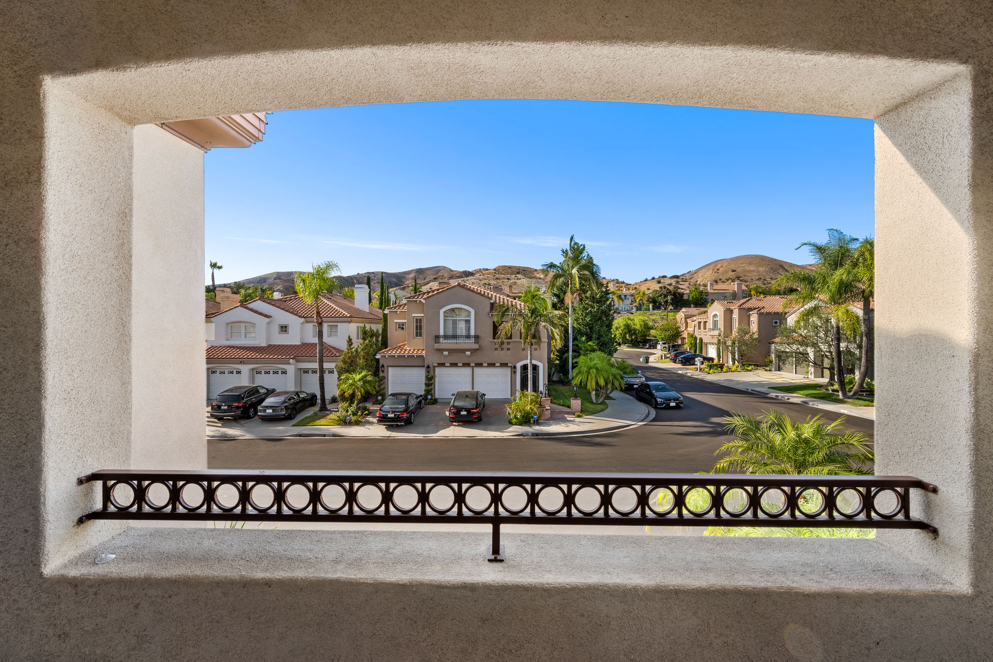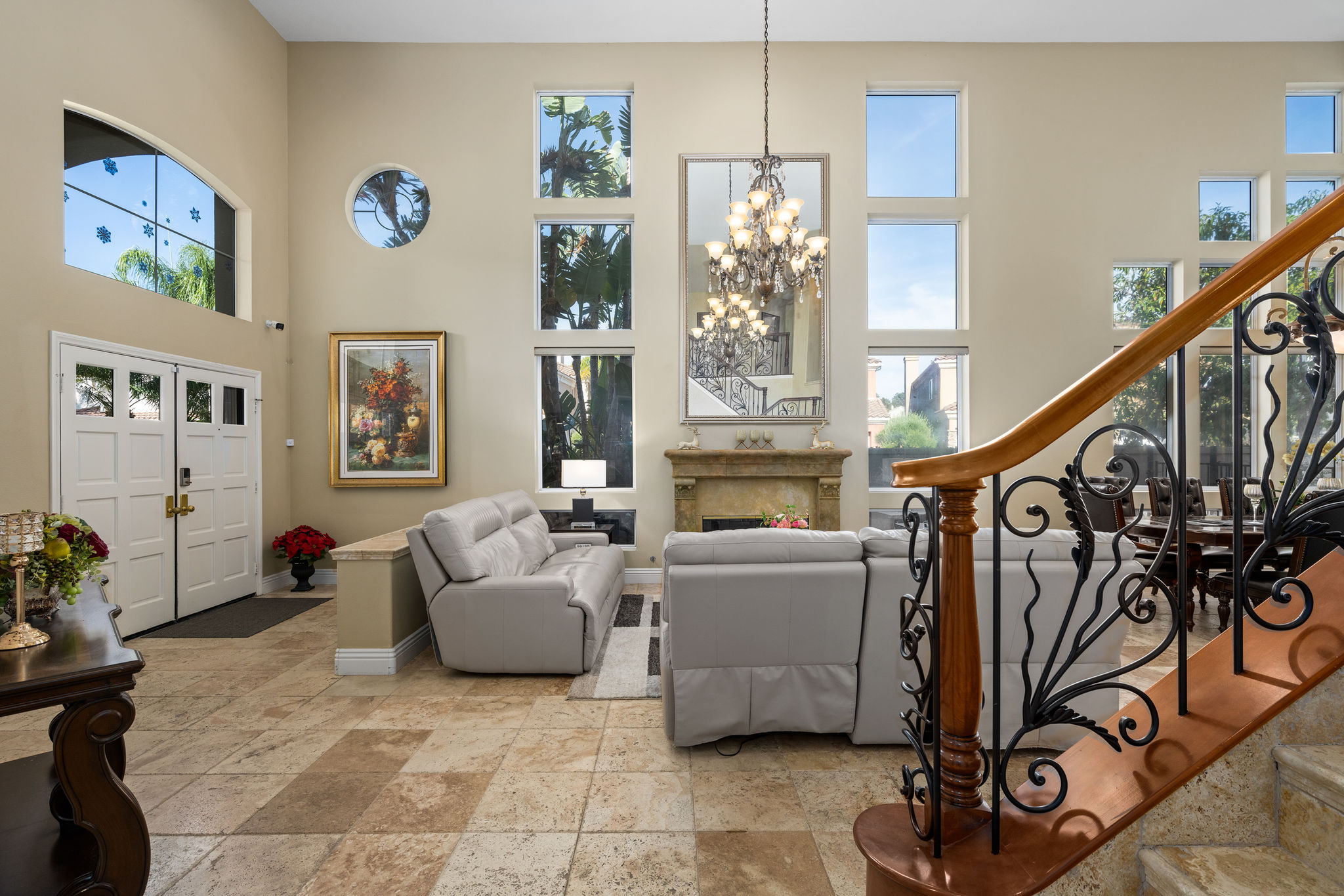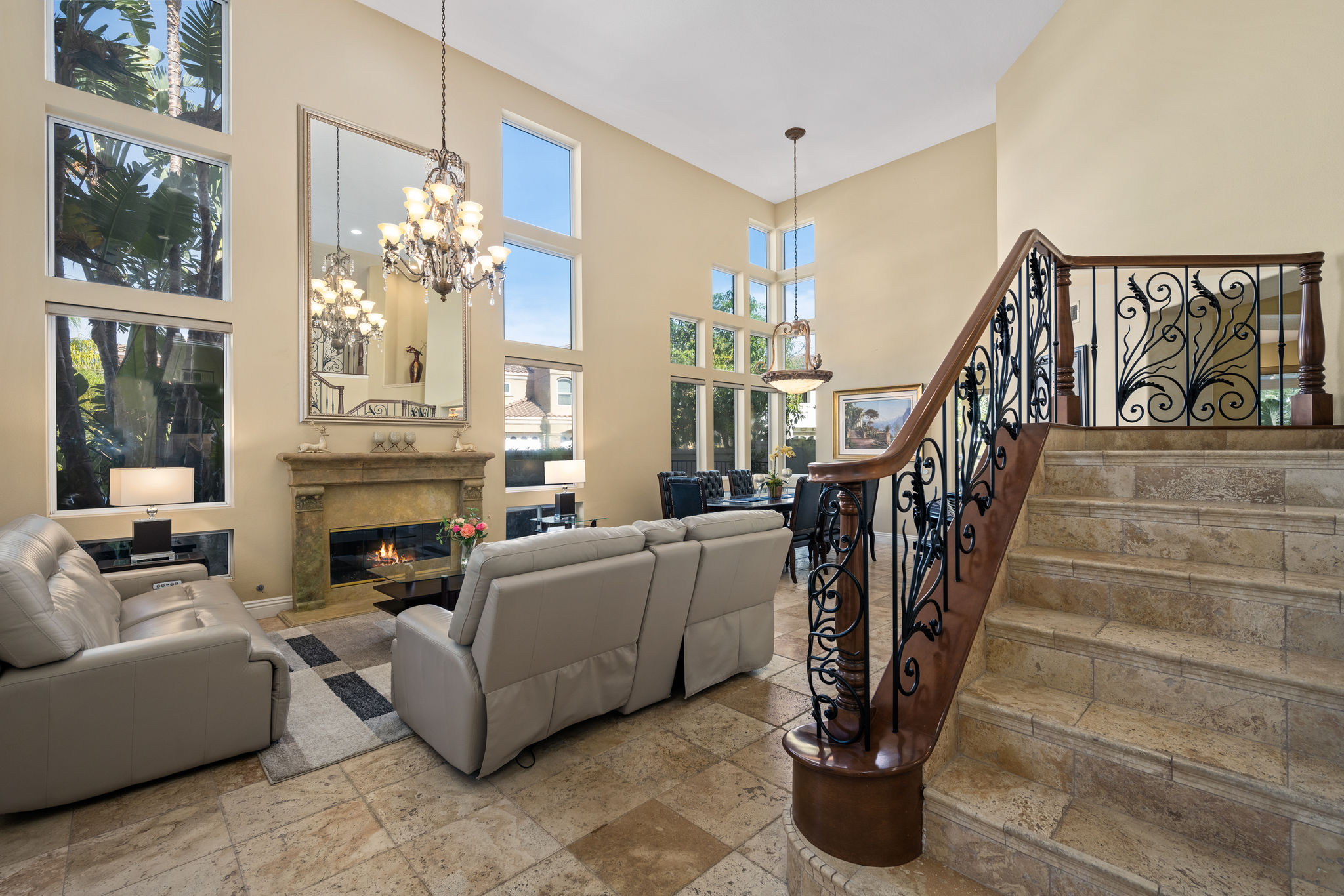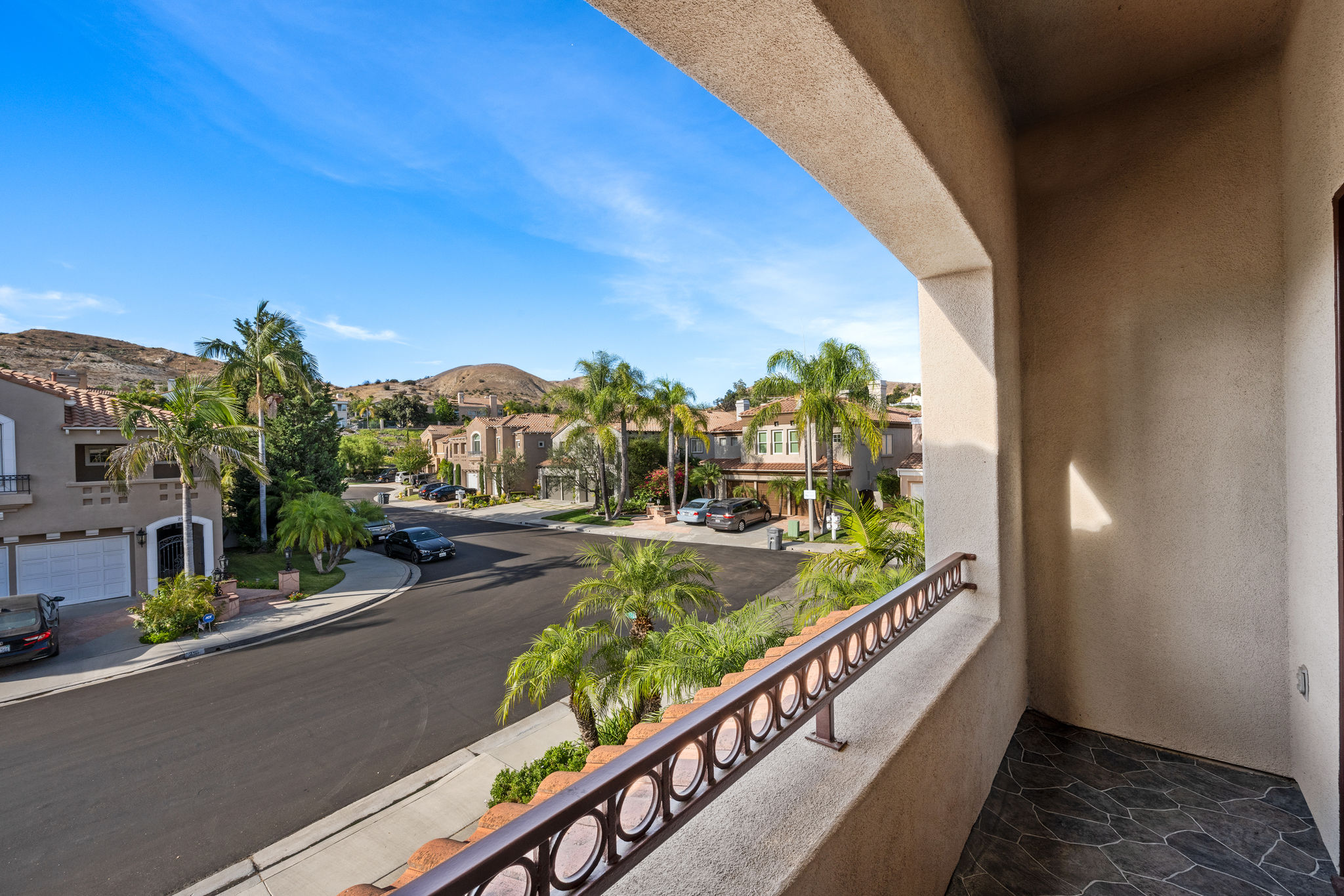 Enjoy the essence of idyllic Foothill Ranch living in this exceptional home, located on a prime inside tract corner lot in the highly sought-after neighborhood of "ROXFORD CREST". Exquisite interior architecture, masterful craftsmanship, elegant finishes, beautiful marble flooring, soaring two-story ceilings, & light-filled rooms welcome you, while the family-oriented floor plan provides comfortable casual living for everyone. This home features 4 bedrooms, 3.5 remodeled bathrooms, a bonus room, and a rare downstairs en-suite bedroom perfect for out-of-town guests. Custom appointments include travertine floors throughout, custom wrought iron and wood staircase, upgraded baseboards, crown molding, upgraded light fixtures, Hunter remote blinds, and two new air conditioners. The remodeled chef's kitchen offers stainless steel appliances, 6 burner stove, a double oven, a custom hood, gorgeous granite countertops, stone backsplash, custom wood cabinetry, a center island, a pantry, and a breakfast nook. The adjoining family room, with a marble accented fireplace, is a perfect place for family gatherings. Enjoy the convenience of a downstairs laundry room with built-in sink and cabinets. The primary suite has high volume ceilings, a sitting area, remodeled bathroom with dual vanities, a walk-in shower, a jetted soaking tub, and a large walk-in closet with custom wood closet organizers. The two additional upstairs bedrooms with custom built-in closets and cabinets share a secondary bathroom. The bonus room/office, teen room with a balcony, and hillside views is a great retreat. You'll just love the tranquil pool-sized backyard, with tropical landscaping, professional hardscape, custom BBQ, bar, and covered patio, for al fresco dining and entertaining.
