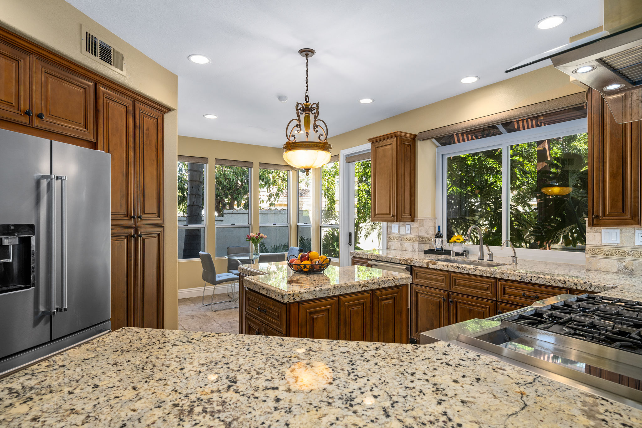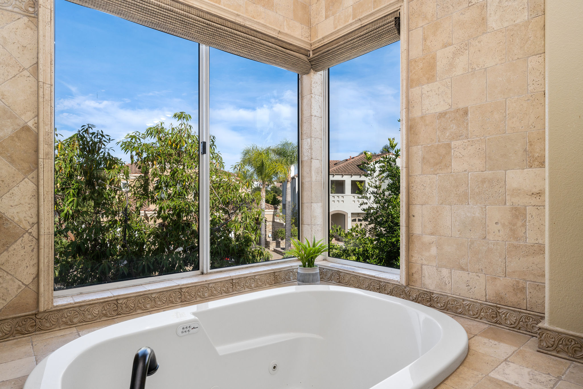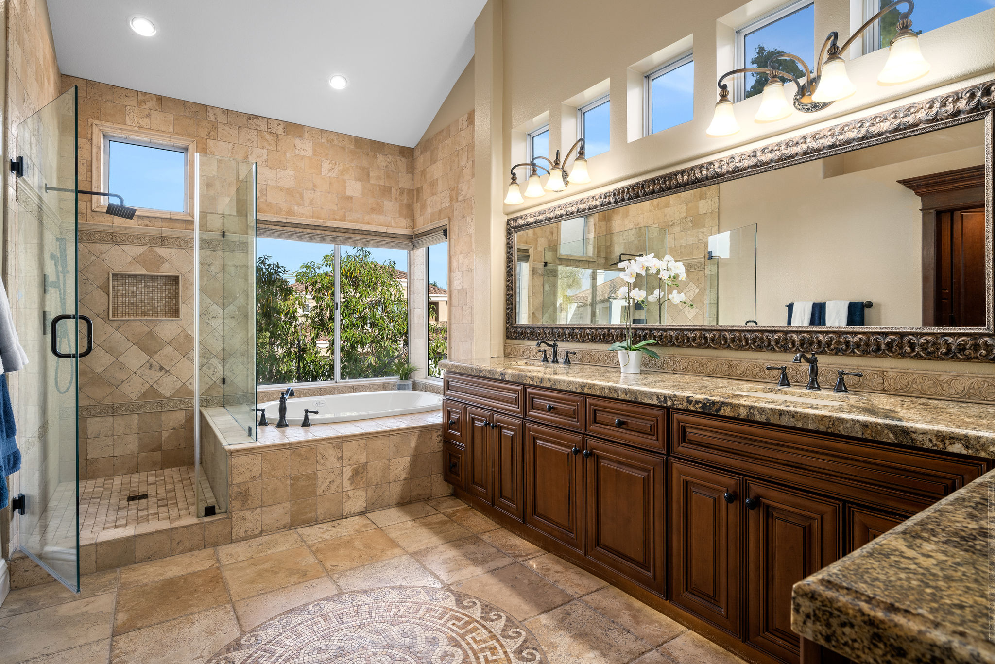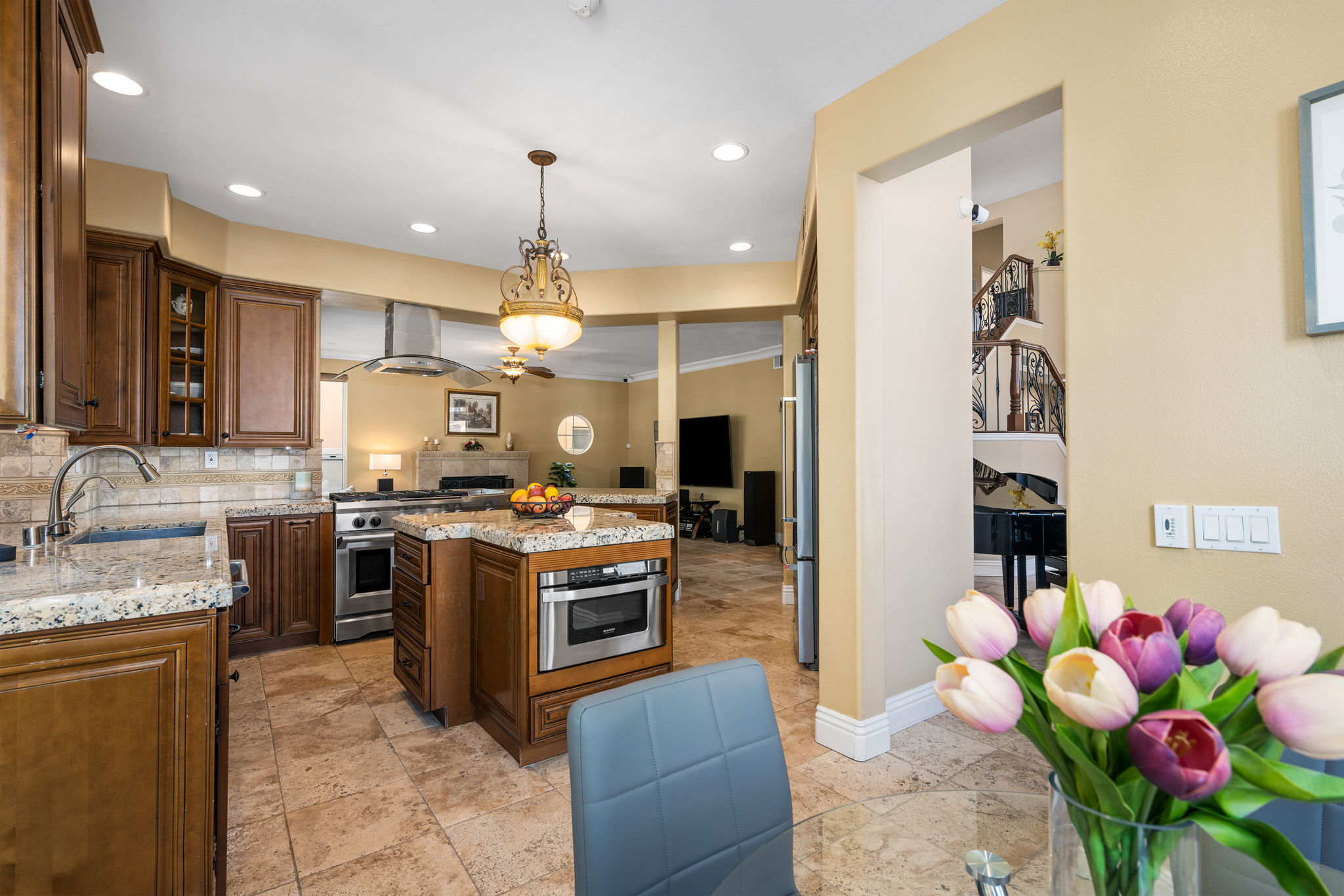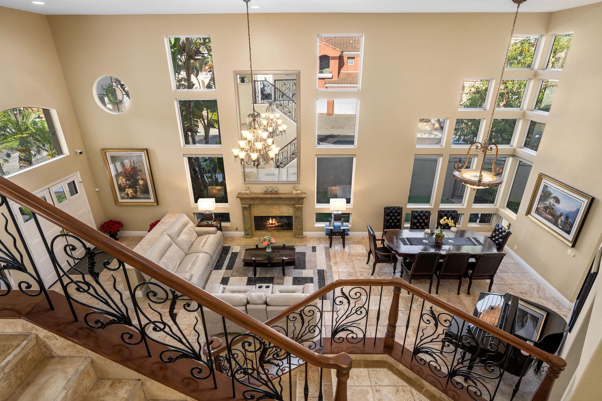 Enjoy the essence of idyllic Foothill Ranch living in this exceptional home, located on a prime inside tract corner lot in the highly sought-after neighborhood of "ROXFORD CREST". Exquisite interior architecture, masterful craftsmanship, elegant finishes, beautiful marble flooring, soaring two-story ceilings, & light-filled rooms welcome you, while the family-oriented floor plan provides comfortable casual living for everyone. This home features 4 bedrooms, 3.5 remodeled bathrooms, a bonus room, and a rare downstairs en-suite bedroom perfect for out-of-town guests. Custom appointments include travertine floors throughout, custom wrought iron and wood staircase, upgraded baseboards, crown molding, upgraded light fixtures, Hunter remote blinds, and two new air conditioners. The remodeled chef's kitchen offers stainless steel appliances, 6 burner stove, a double oven, a custom hood, gorgeous granite countertops, stone backsplash, custom wood cabinetry, a center island, a pantry, and a breakfast nook. The adjoining family room, with a marble accented fireplace, is a perfect place for family gatherings. Enjoy the convenience of a downstairs laundry room with built-in sink and cabinets. The primary suite has high volume ceilings, a sitting area, remodeled bathroom with dual vanities, a walk-in shower, a jetted soaking tub, and a large walk-in closet with custom wood closet organizers. The two additional upstairs bedrooms with custom built-in closets and cabinets share a secondary bathroom. The bonus room/office, teen room with a balcony, and hillside views is a great retreat. You'll just love the tranquil pool-sized backyard, with tropical landscaping, professional hardscape, custom BBQ, bar, and covered patio, for al fresco dining and entertaining.