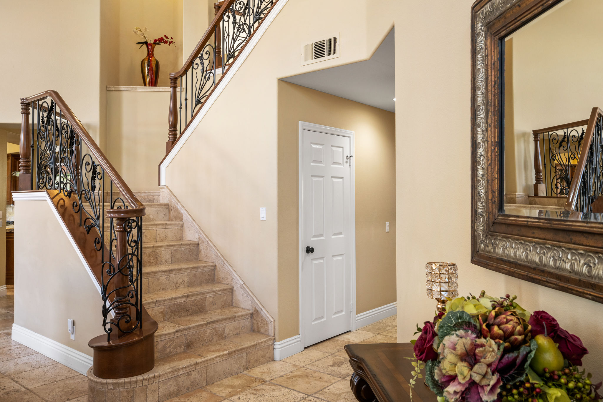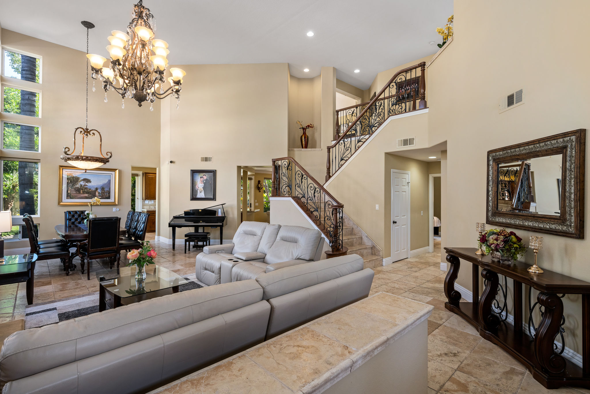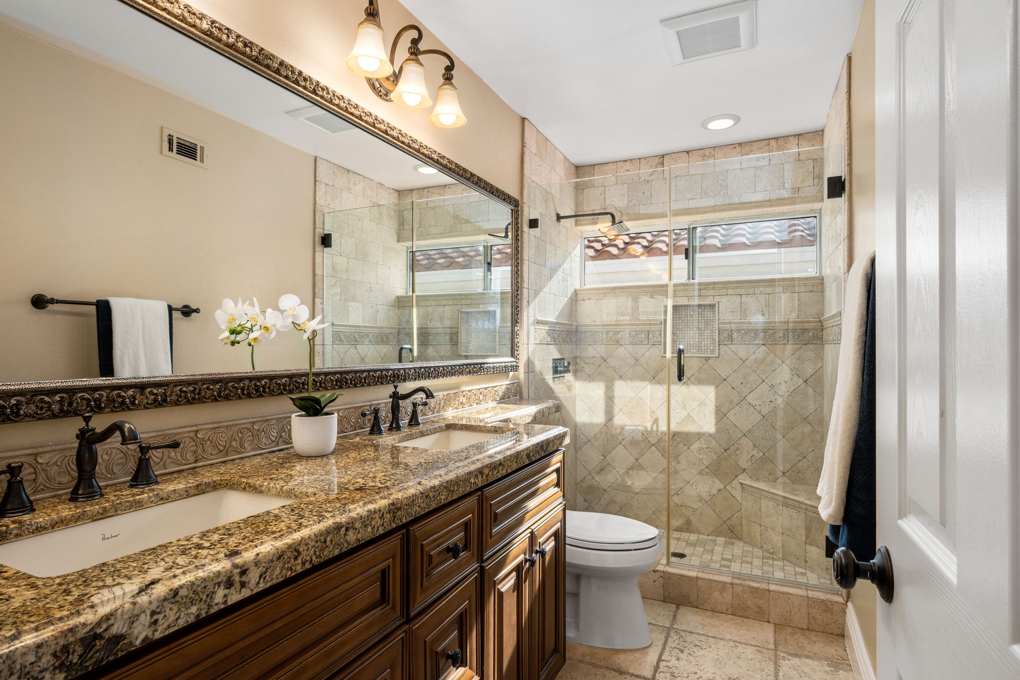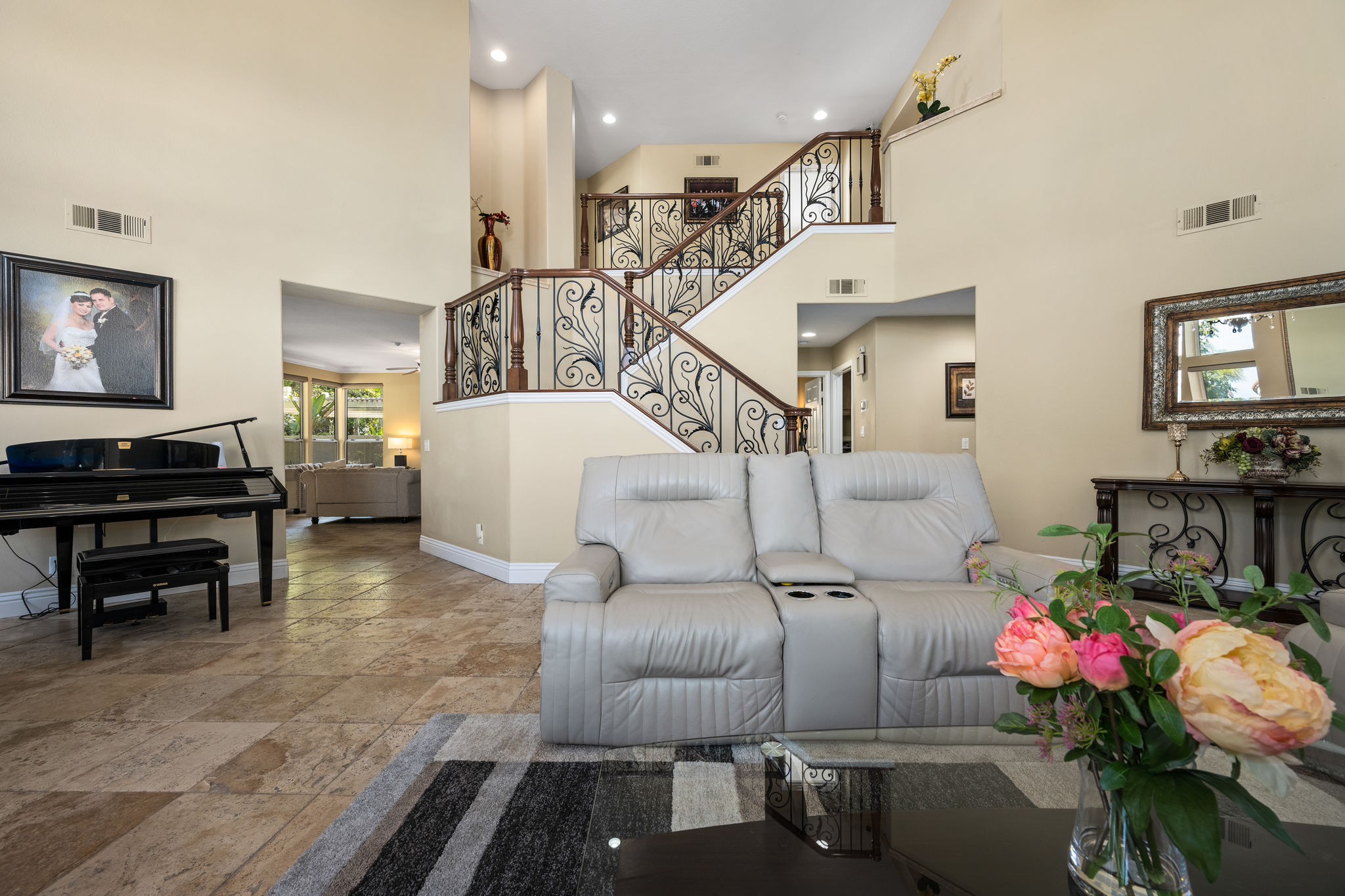 Enjoy the essence of idyllic Foothill Ranch living in this exceptional home, located on a prime inside tract corner lot in the highly sought-after neighborhood of "ROXFORD CREST". Exquisite interior architecture, masterful craftsmanship, elegant finishes, beautiful marble flooring, soaring two-story ceilings, & light-filled rooms welcome you, while the family-oriented floor plan provides comfortable casual living for everyone. This home features 4 bedrooms, 3.5 remodeled bathrooms, a bonus room, and a rare downstairs en-suite bedroom perfect for out-of-town guests. Custom appointments include travertine floors throughout, custom wrought iron and wood staircase, upgraded baseboards, crown molding, upgraded light fixtures, Hunter remote blinds, and two new air conditioners. The remodeled chef's kitchen offers stainless steel appliances, 6 burner stove, a double oven, a custom hood, gorgeous granite countertops, stone backsplash, custom wood cabinetry, a center island, a pantry, and a breakfast nook. The adjoining family room, with a marble accented fireplace, is a perfect place for family gatherings. Enjoy the convenience of a downstairs laundry room with built-in sink and cabinets. The primary suite has high volume ceilings, a sitting area, remodeled bathroom with dual vanities, a walk-in shower, a jetted soaking tub, and a large walk-in closet with custom wood closet organizers. The two additional upstairs bedrooms with custom built-in closets and cabinets share a secondary bathroom. The bonus room/office, teen room with a balcony, and hillside views is a great retreat. You'll just love the tranquil pool-sized backyard, with tropical landscaping, professional hardscape, custom BBQ, bar, and covered patio, for al fresco dining and entertaining.