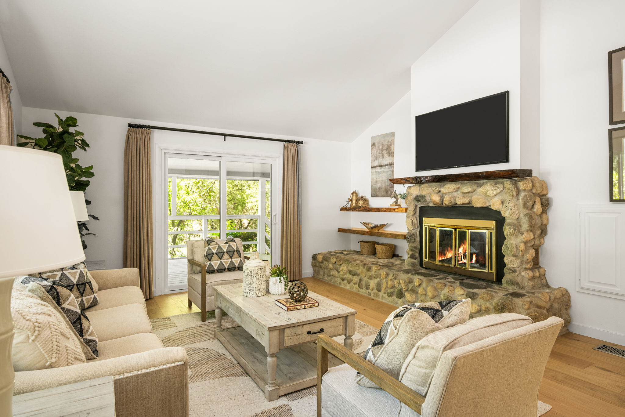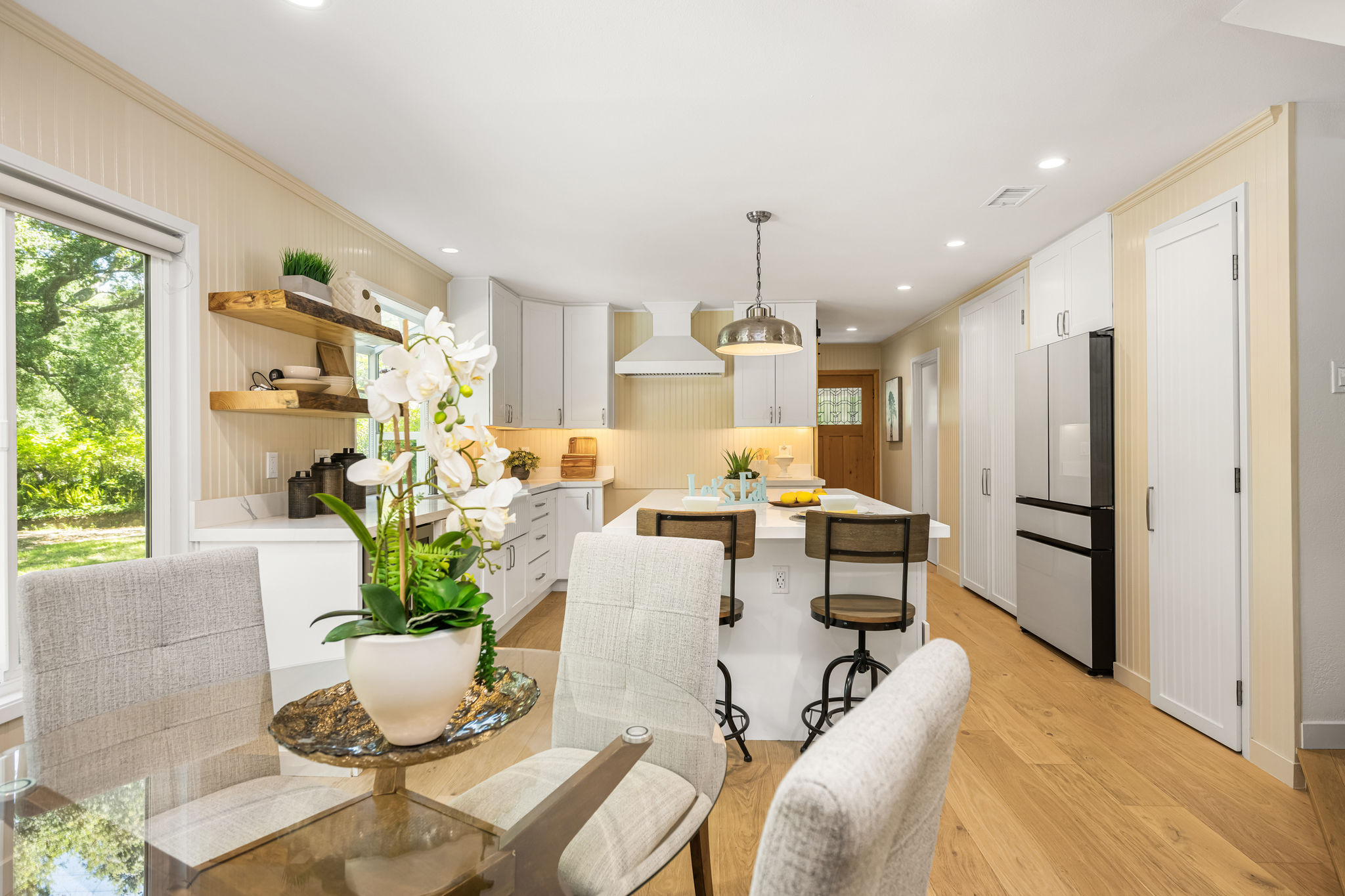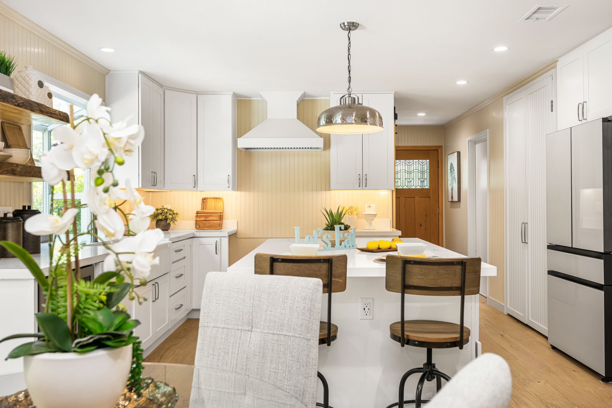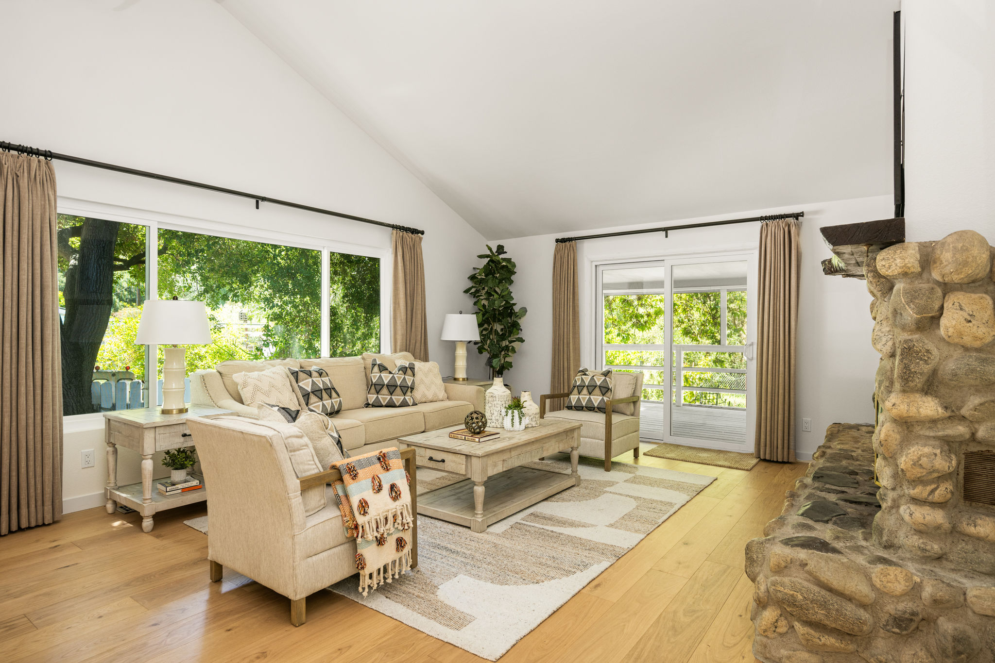 Tucked away in a stunning canyon setting with thoughtful recent upgrades, this 3-bedroom, 3-bathroom home is a rare and remarkable retreat offering the perfect fusion of comfort, charm, and natural beauty. Step inside to a warm and inviting interior featuring a spacious, light-filled layout. The main floor boasts a coveted downstairs bedroom and full bathroom—ideal for guests, a private office, or multi-generational living. Enjoy the beautifully renovated designer kitchen with modern finishes and custom cabinetry, as well as an adjacent upgraded bathroom with matching contemporary style. This home offers multiple living areas, including a cozy living room with a wood-burning fireplace and an enclosed back porch—providing the perfect backdrop for entertaining or relaxing with loved ones. Upstairs, the generous primary bedroom with an ensuite full bathroom is a true sanctuary, complete with an enclosed balcony offering peaceful views of the lush canyon landscape. Adjacent to the primary suite is an additional bedroom with its own ensuite full bathroom and a large storage room hidden behind the closet space. Set on an expansive, flat 'double lot', this gated property offers ultimate privacy, a tranquil creek-side ambiance, and the serenity of peaceful, nature-filled living—an absolute dream for outdoor lovers and nature enthusiasts. Additional highlights include an attached 2-car garage, roof-mounted fire sprinklers, and enclosed eaves for added safety. With ample space for gardens, gatherings, or future expansion, this property is more than a home—it’s a private canyon oasis offering a lifestyle of beauty, serenity, and inspiration. Don’t miss this rare opportunity to own a one-of-a-kind canyon escape where every detail has been thoughtfully crafted for peaceful, elevated living.