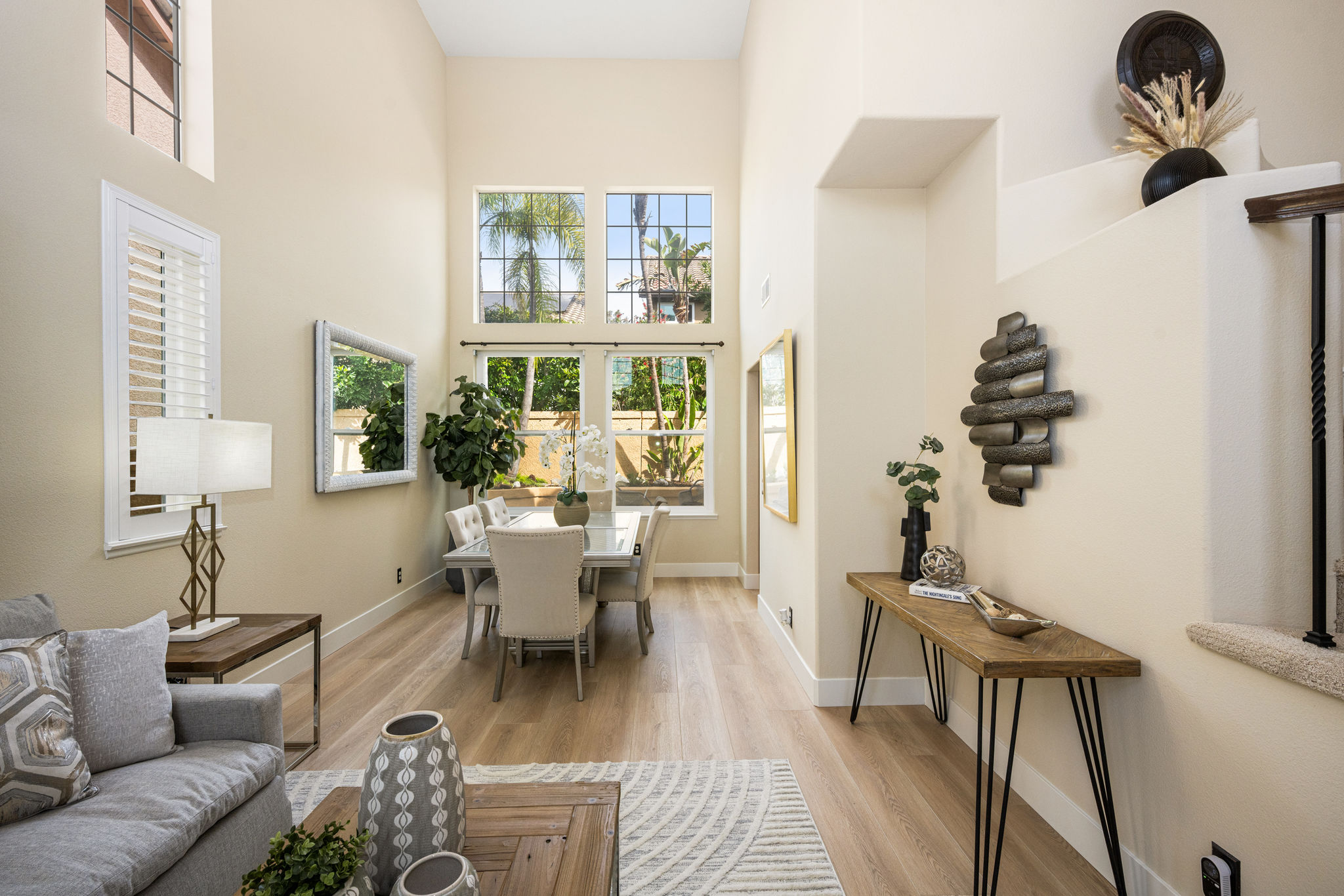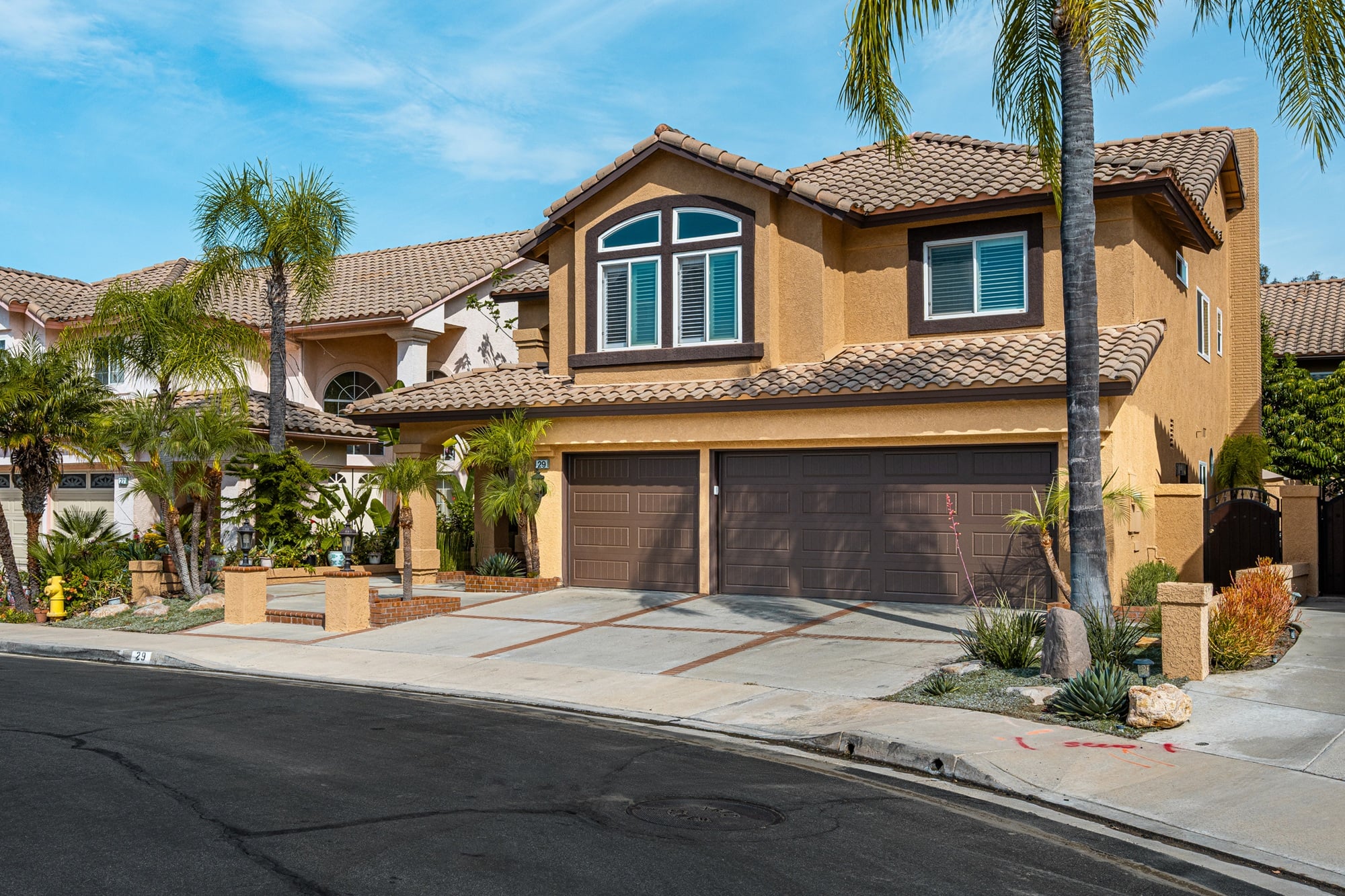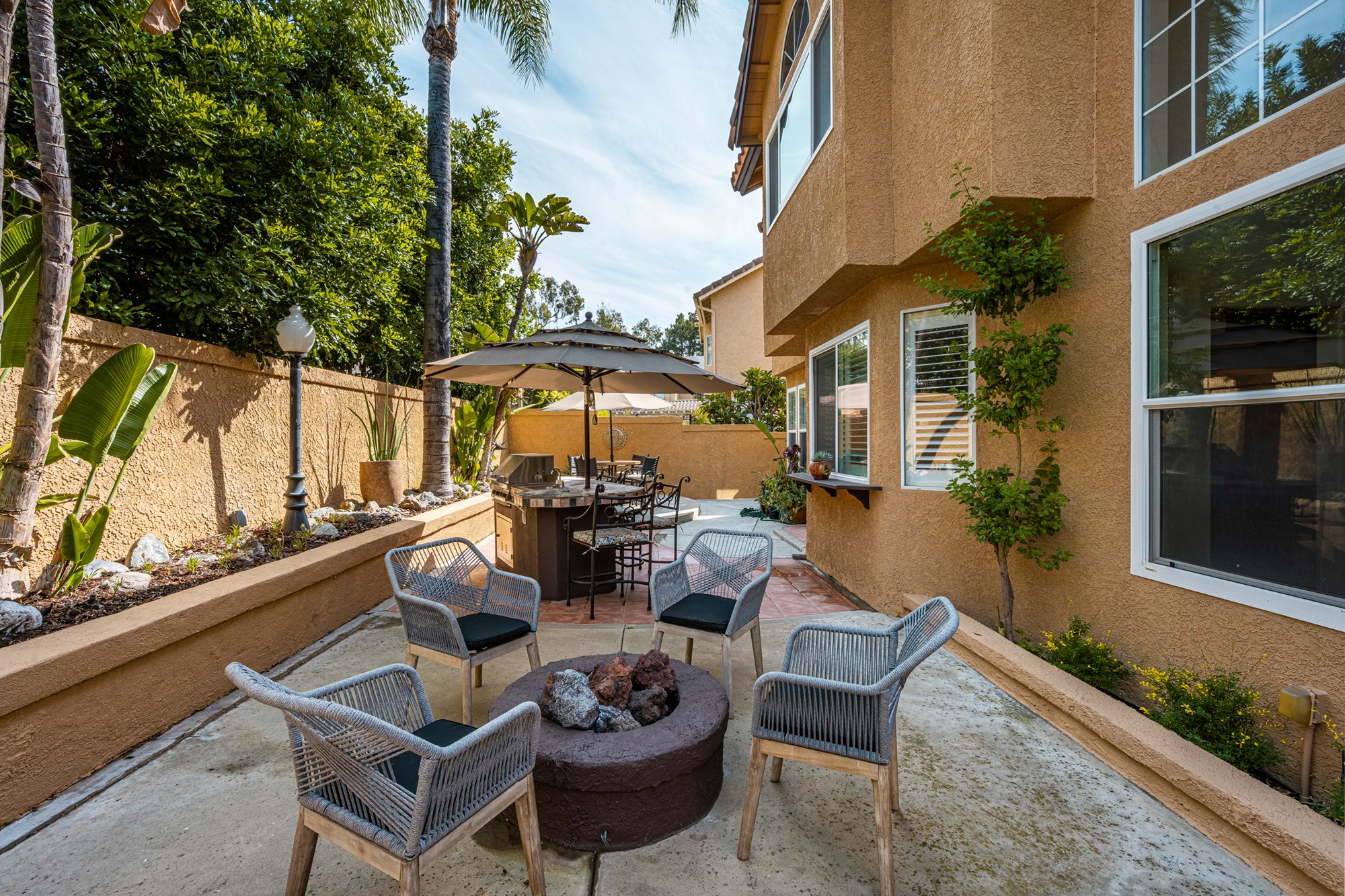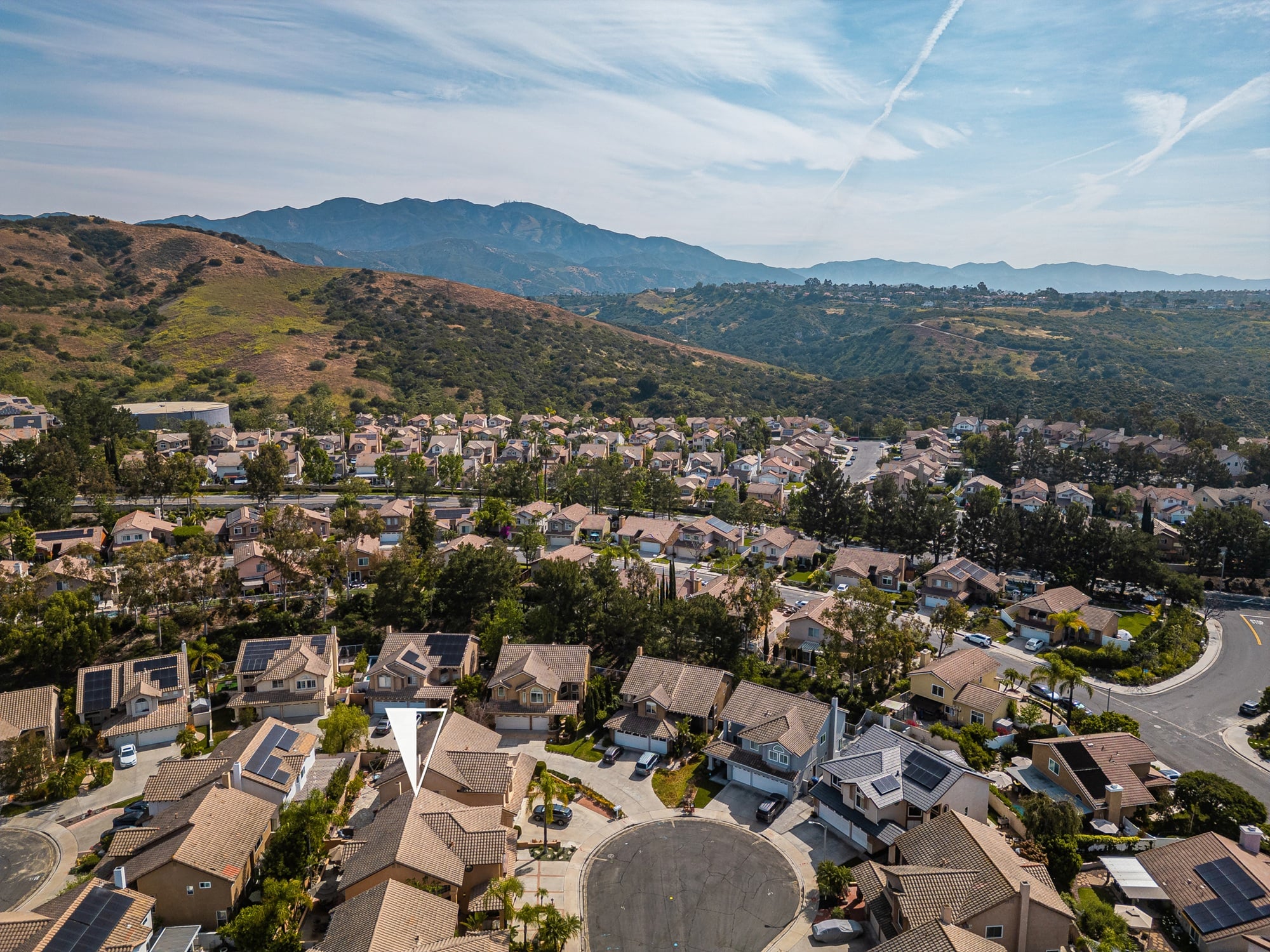 Nestled on a quiet, tree-lined street in the wonderful hillside community of Foothill Ranch, this stunning residence has all the bells and whistles and will surely capture your heart! Built by William Lyon, this inviting home boasts 4 bedrooms, 2.5 bathrooms, and 2,233 square feet of stylish, open-concept living with upgraded finishes and inviting outdoor spaces that inspire comfortable living and entertaining. Guests are welcomed through custom iron double doors into a bright foyer that opens to a spacious formal living room and dining room with soaring ceilings and walls of windows that bring in natural light. The heart of the home is the remodeled kitchen with granite countertops, custom backsplash, upgraded appliances, and a breakfast nook that opens to the family room—the perfect place for gatherings. Custom upgrades include new luxury vinyl flooring, new carpet, plantation shutters, vinyl windows, recessed lighting, upgraded baseboards, fresh paint, a remodeled guest bathroom, a newer water heater, and an upgraded electrical panel. There is also a convenient downstairs laundry room. The spacious primary suite boasts a vaulted ceiling, a large walk-in closet, and a fully remodeled bathroom with a tiled shower, a seamless glass enclosure, a custom standalone tub, a quartz vanity with dual sinks, new mirrors, and light fixtures. Three additional bedrooms share a remodeled secondary bathroom. The backyard offers a private setting for relaxation and entertaining, with a built-in BBQ and a fire pit. With custom upgrades throughout, a three-car garage, and a peaceful cul-de-sac location, this Foothill Ranch home offers a rare opportunity and is in true move-in condition.